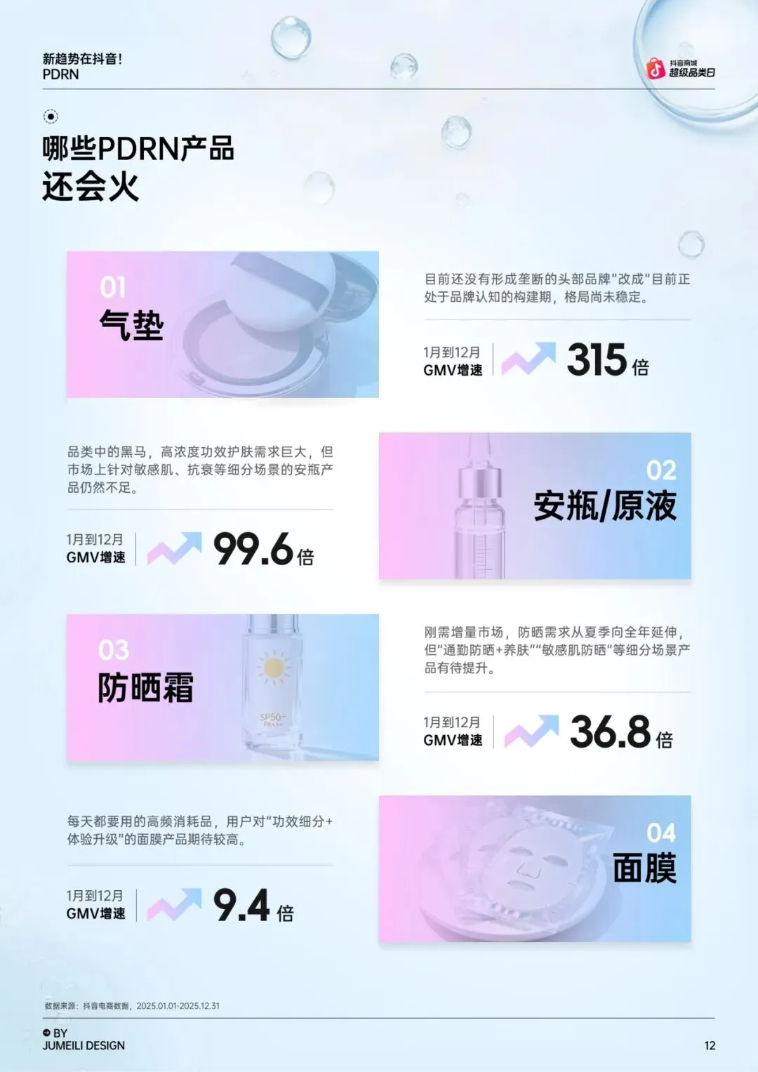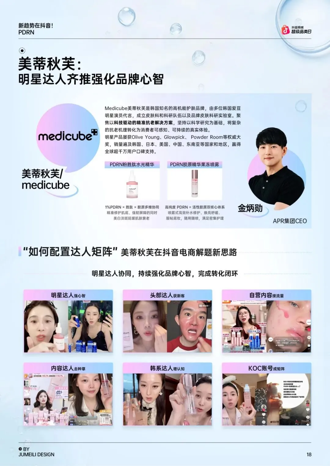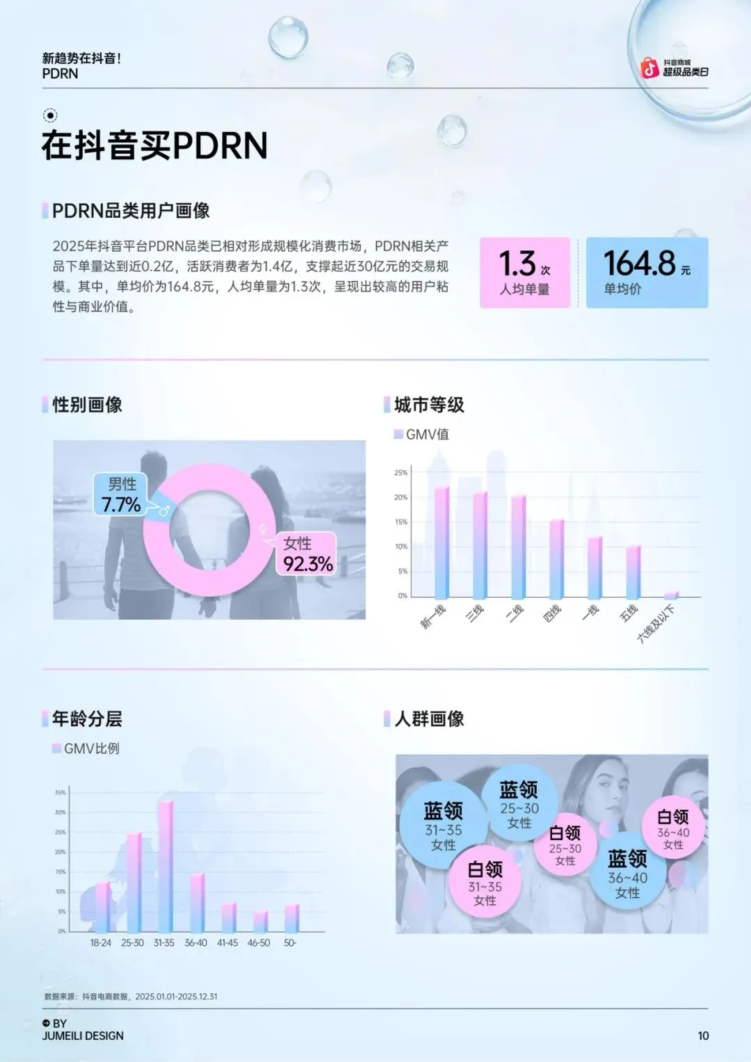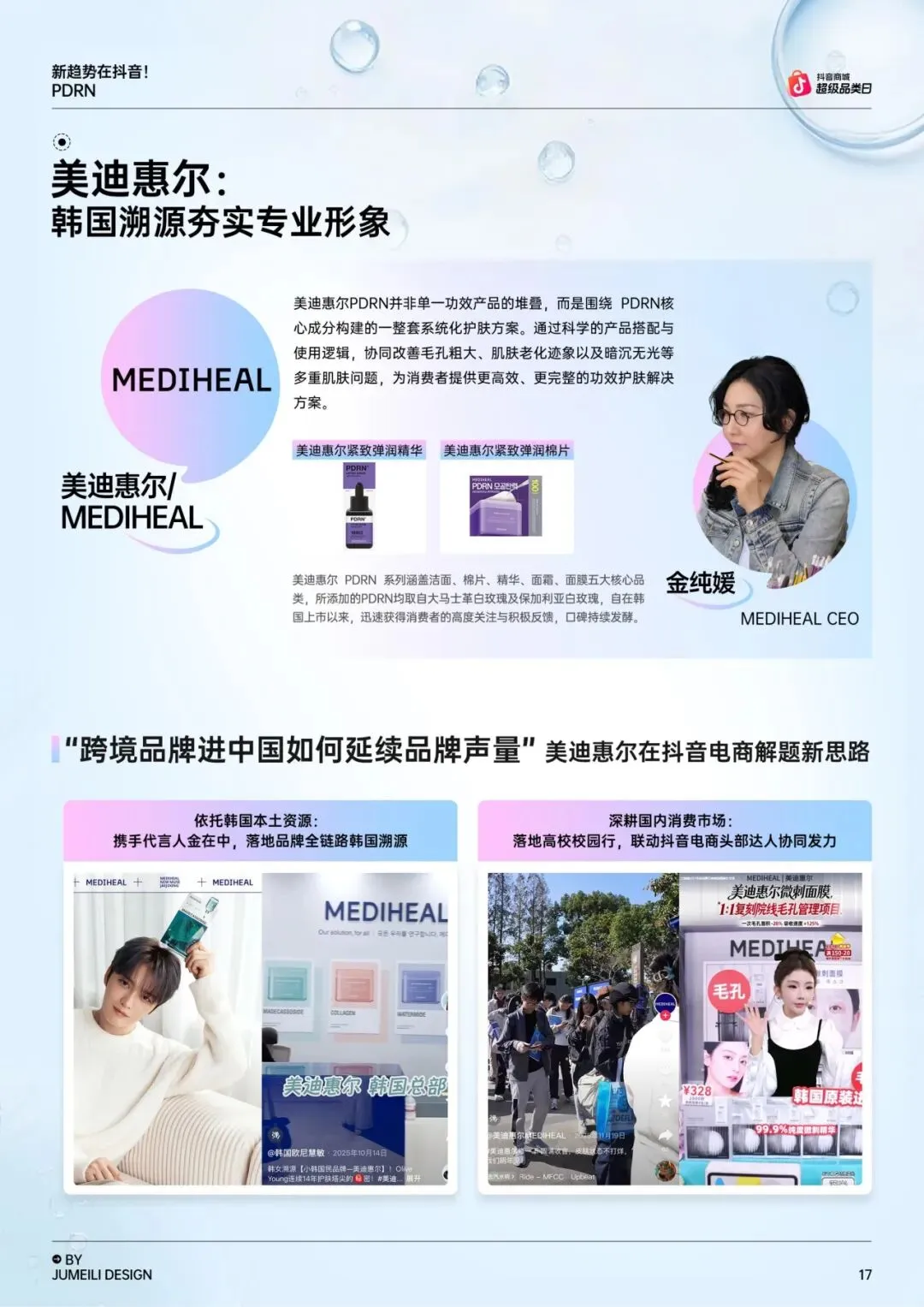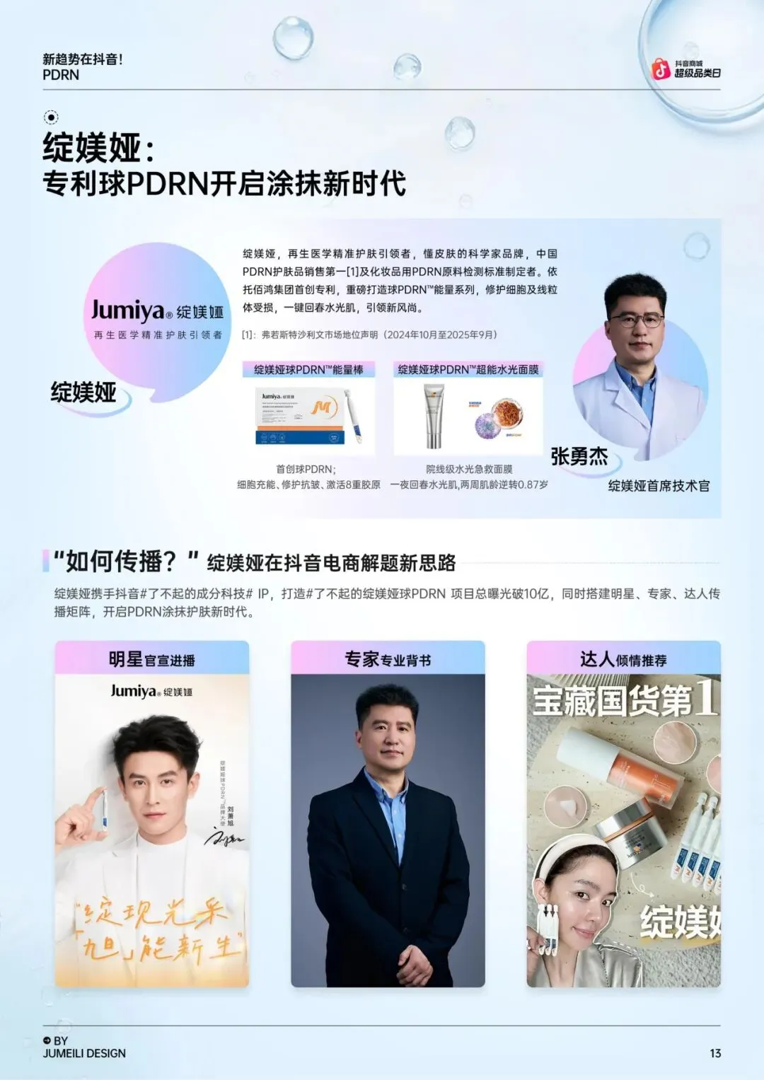 《PDRN趋势报告》首次全面呈现了PDRN赛道的爆发态势:全球范围内,化妆品级PDRN市场未来7-10年将保持10%-11.5%的双位数增速,远超传统护肤成分4-6%的平均水平;中国市场更显活力,2024年含PDRN成分的商品达17644个,品牌与工厂数量分别突破4000家和1300家,2025年其在护肤领域的占比已攀升至4.8%。