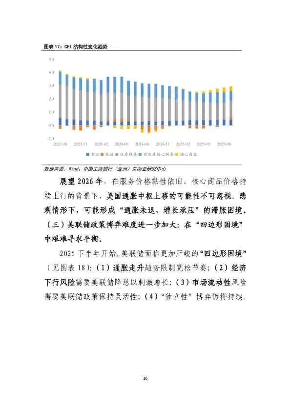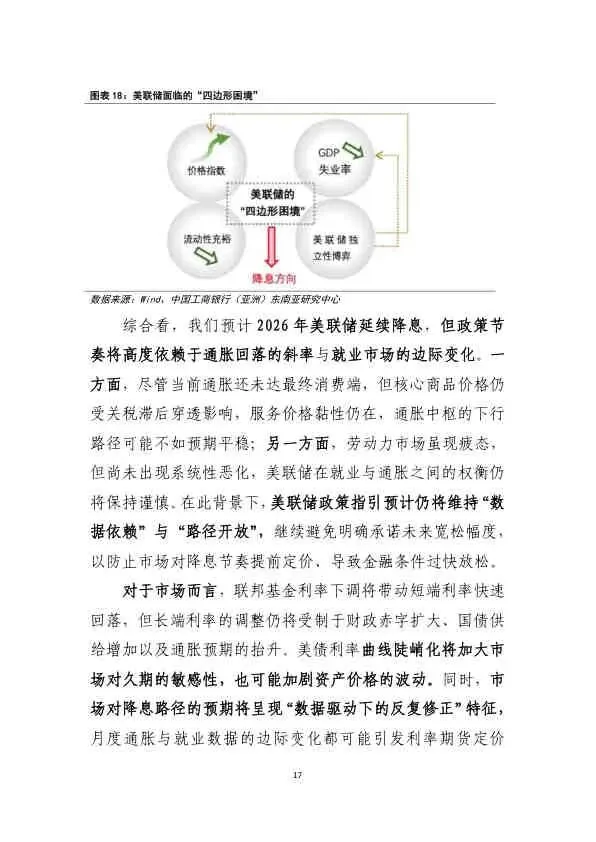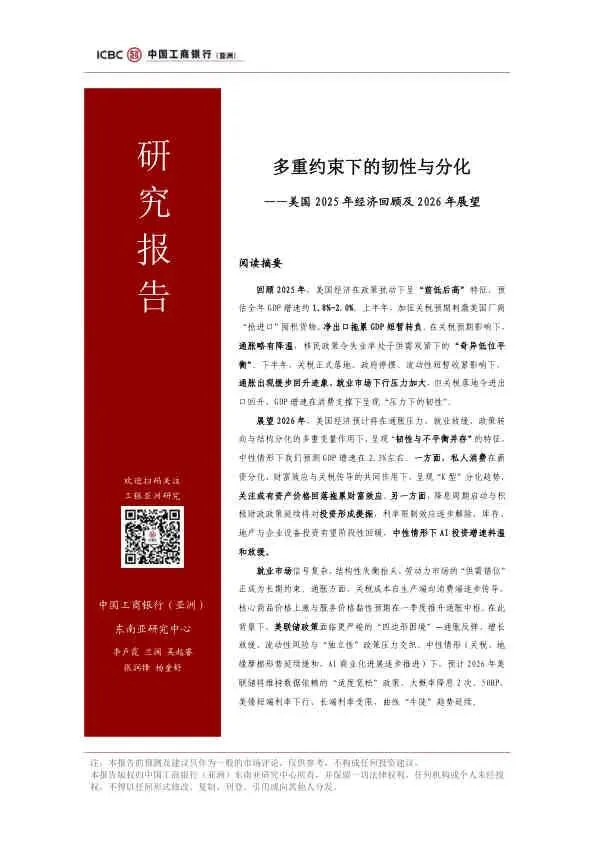 2025年美国经济在政策扰动下展现出“前低后高”的韧性,但增长代价是加剧了内部的结构性分化。展望2026年,在通胀压力、就业放缓、政策转向与结构分化的多重变量交织下,美国经济将呈现“韧性与不平衡并存”的特征。美联储将面临严峻的“四边形困境”,预计全年降息2次(50BP),以数据依赖的方式谨慎引导经济软着陆。