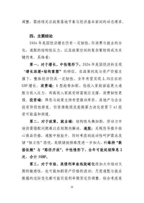 2026年美国经济的增长韧性将与内部的不平衡(消费K型分化、劳动力市场结构性失衡、通胀结构性压力)并存。政策空间受到多重约束,美联储的决策难度加大。投资者需密切关注月度通胀与就业数据的边际变化,这些数据将反复修正市场对降息路径的预期,并加剧资产价格波动。
