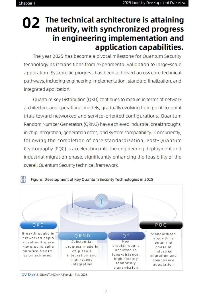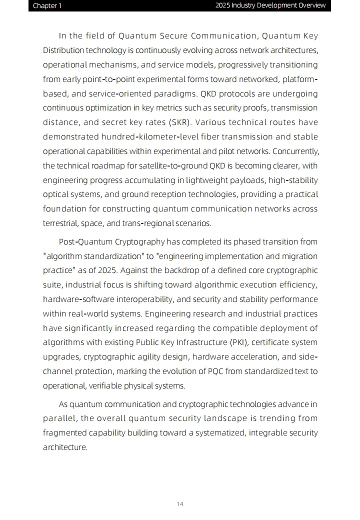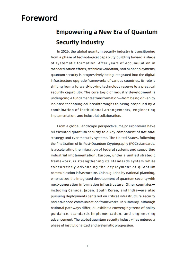 2026年,全球量子安全产业正从技术能力构建阶段向体系化形成阶段转型,历经多年标准化建设、技术验证与试点部署,已逐步融入各国数字基础设施升级框架,其角色从前瞻性技术储备转向实用化安全能力,产业发展逻辑也从孤立技术突破驱动,转向制度安排、工程实施与产业协作协同推进。