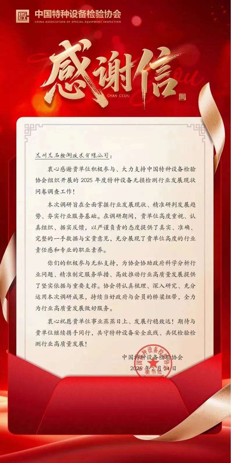 近日,兰州兰石检测技术有限公司收到中国特种设备检验协会发来的感谢信,信中对公司积极参与2025年度特种设备无损检测行业发展现状问卷调查工作、为行业高质量发展贡献专业数据与宝贵智慧的行动,予以高度肯定并致以诚挚感谢。