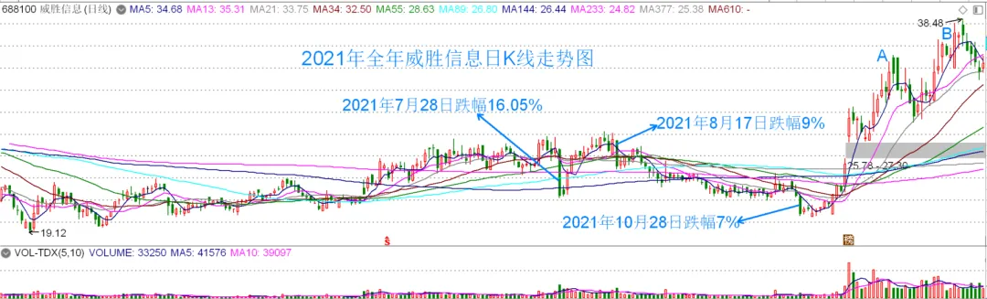 关注这个行业,还有一个重要的原因是,在2021年曾经买入过威胜信息这只股票。2021年威胜信息虽然历经多次当日大幅度下跌,最终年度涨幅相当可观,是当年的受益股之一。下图中标记的A、B点即为两次卖出的位置。