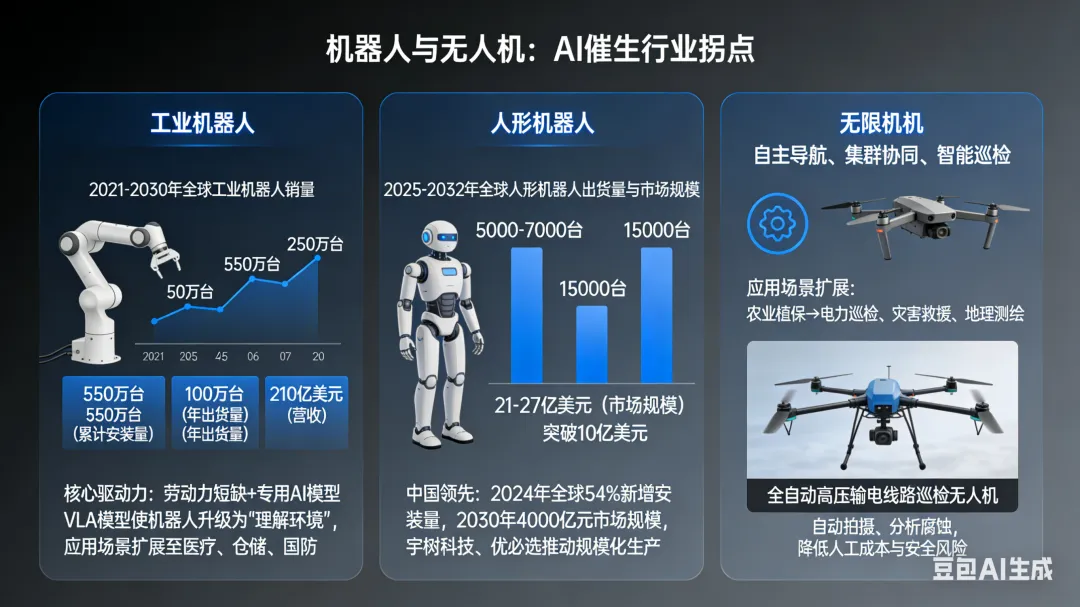 工业机器人行业已沉寂多年,2021 年以来全球年销量始终徘徊在 50 万台左右。但德勤预测,2026 年将是重要的蓄力期,全球工业机器人累计安装量将达 550 万台,而 2030 年将迎来爆发式增长,年出货量翻倍至 100 万台,营收突破 210 亿美元。这一拐点的核心驱动力来自两方面:一是发达国家劳动力短缺加剧,制造业回流推动自动化需求;二是专用 AI 模型的出现,让机器人从 “执行指令” 升级为 “理解环境”。视觉 - 语言 - 动作(VLA)模型的普及,使机器人能够通过自然语言理解任务、通过视觉感知环境、通过动作完成复杂操作,应用场景从传统制造业扩展至医疗保健、仓储物流、国防等领域。人形机器人成为最受关注的赛道。2025 年全球人形机器人出货量在 5000 至 7000 台之间,2026 年将增至 15000 台,市场规模达 2.1 亿至 2.7 亿美元;到 2032 年,这一市场规模有望突破 10 亿美元。中国在该领域已形成领先优势,2024 年全球超 54% 的工业机器人新增安装量来自中国,预计 2030 年中国具身智能产业市场规模将达 4000 亿元,宇树科技、优必选等企业正在推动人形机器人的规模化生产。无人机领域同样迎来 AI 赋能。自主导航、集群协同、智能巡检等功能日益成熟,应用场景从农业植保扩展至电力巡检、灾害救援、地理测绘等。中国、英国、南澳大利亚等地已开始测试全自动高压输电线路巡检无人机,能够自动拍摄、分析腐蚀情况,大幅降低人工成本和安全风险。五、SaaS 行业重构:智能体改写商业模式
