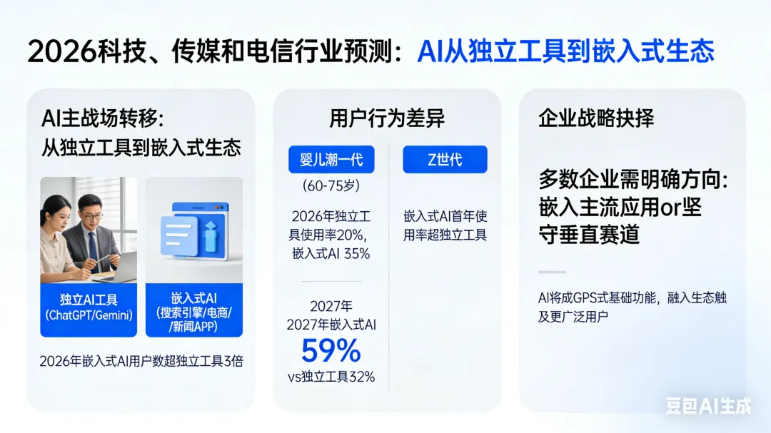 当 AI 从实验室走向规模化应用,当短视频与卫星互联网重塑连接形态,科技、传媒和电信(TMT)行业正站在新旧交替的关键节点。德勤《2026 科技、传媒和电信行业预测》报告揭示(请在公众号后台回复“《2026 科技、传媒和电信行业预测》”获取报告完整版)。这一年将是技术理性落地的关键年 ——AI 理想与现实的差距持续缩小,跨行业融合加速渗透,而看似平淡的基础能力夯实,正在孕育颠覆式变革。本文将拆解 13 大核心趋势,带你看清 TMT 行业的未来走向。一、AI 主战场转移:从独立工具到嵌入式生态