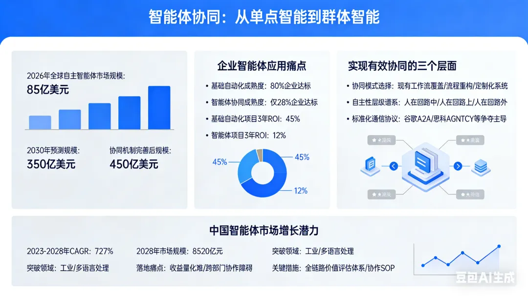 自主智能体(Autonomous AI agents)被视为下一个变革性技术,但德勤指出,2026 年的核心突破口并非单个智能体的能力提升,而是多智能体的协同调度。预计到 2026 年,全球自主智能体市场规模将达 85 亿美元,2030 年有望增至 350 亿美元,若协同机制完善,这一数字可能进一步提升至 450 亿美元。当前企业在智能体应用中面临的最大痛点,是技术成熟度与实际需求的脱节。德勤调查显示,80% 的企业认为自身在基础自动化方面能力成熟,但仅有 28% 的企业认为在智能体协同方面达到同等水平;45% 的基础自动化项目能在三年内实现 ROI,而智能体相关项目的这一比例仅为 12%。要实现有效的协同,企业需从三个层面着手:一是选择合适的协同模式,如在现有工作流上添加智能覆盖层、重构流程实现代理原生设计,或针对高优先级领域部署定制化协同系统;二是建立 “自主性层级谱系”,根据任务复杂度选择人在回路中(实时参与)、人在回路上(监控介入)或人在回路外(完全自主)的模式;三是构建标准化的通信协议,谷歌 A2A、思科 AGNTCY 等协议正在争夺主导地位,2026 年将形成两到三个主流标准。中国智能体市场展现出强劲增长潜力,2023-2028 年 CAGR 预计达 72.7%,2028 年市场规模将达 8520 亿元。在工业、多语言处理等领域,国产智能体已实现突破,但商业落地仍面临收益量化难、跨部门协作障碍等问题,建立全链路价值评估体系和协作 SOP 成为关键。四、机器人与无人机:AI 催生行业拐点