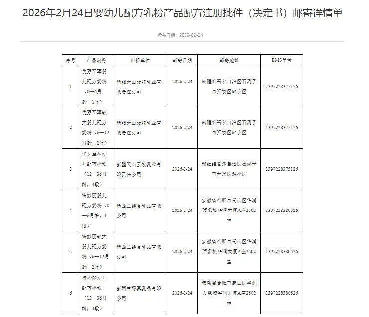 2月24日,国家市场监督管理总局食品审评中心发布新一批的婴幼儿配方乳粉产品配方注册批件(决定书)邮寄信息,涉及新疆天山云牧乳业、新西兰醇真乳品2家企业的6款产品。
