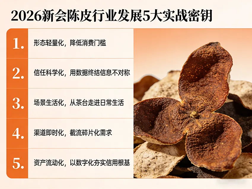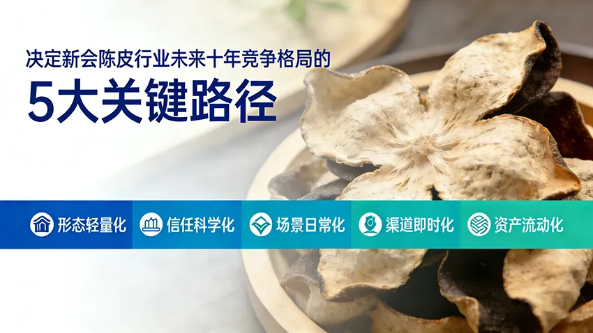 【兴茶网 资讯】如果把陈皮产业过去十年的狂飙突进比作一场“豪赌”,那么2026年,这场赌局的规则已经彻底改写。在经历了2025年关于年份虚标、产地造假等问题的行业审视后,陈皮产业的发展重心,正从以往偏重“收藏金融”属性的模式,加速回归至“硬核消费”的价值本位。站在2026年的行业拐点,新会陈皮行业如何打破增长瓶颈?在展望未来之前,必须正视作为行业分水岭的2025年。这一年,新会陈皮产业在产量扩张与强力监管的阵痛中,经历了一场深刻的“价值回归”。2025年初,行业数据表面依然亮眼。2024年全产业链产值突破261亿元,种植面积达14.3万亩,经营主体超7800家。然而,繁荣之下暗藏结构性压力。外围产区大幅扩张叠加新会本地持续扩种,已形成“百万亩”量级的供给预期。与之相对,春节后终端市场动销明显乏力,“丰产不丰收”的寒意开始弥漫。年内,规范化与白热化竞争并行。“陈皮生产工”被正式纳入国家新职业,为超7万从业者确立路径。与此同时,竞品浦北陈皮通过高铁冠名等营销动作强势合围,市场竞争进入深水区。资本与危机交织的图景在年底显现。一方面,广药集团、同仁堂等大健康头部企业加大布局,推动产业升级;另一方面,年末央视曝光横跨两广的陈皮造假产业链,涉及年份虚标、产地假冒等问题,引发行业震荡,随之而来的最强监管,标志着旧有发展模式的终结。2026年,新会陈皮行业站在抉择路口:是固守旧叙事,在存量市场中内卷;还是彻底转向“硬核消费”,在万亿健康市场中开创新蓝海。显然,价值回归,已成为必然选择。兴茶君经过深度调研发现,形态轻量化、信任科学化、场景日常化、渠道即时化、资产流动化,正成为决定新会陈皮行业未来十年竞争格局的五大关键路径。2026年,陈皮市场最主要的增长动力,预计将不再源于完整三瓣干皮,而是来自经过标准化、便携化、深加工的创新产品形态。长期以来,陈皮的消费存在着不低的知识与时间门槛。从辨别产区年份,到洗皮、醒皮、备器、长时间煮泡,这一系列源于传统的、富有仪式感的“慢”流程,与追求高效、便捷的现代生活节奏之间,产生了显著矛盾,无形中劝退了许多潜在消费者,尤其是年轻客群与忙碌的上班族。破局的关键在于“做轻”——最大限度地降低消费者的尝试成本和使用门槛,让陈皮能以更友好、更轻松的姿态融入多种高频生活场景。例如,针对办公室场景,可推出独立小包装的陈皮速溶粉、冷萃原液,实现“秒速即饮”;针对差旅与户外活动,可开发即泡即饮的巧克力片状、单颗龙珠形态;甚至可将其制成细粉,作为便捷的烹饪调味料。这实质上是一场产品逻辑的转变:从“需要精心伺候的收藏品”,转向“随时服务生活的日常伴侣”。当陈皮能像一条精品咖啡液那样随手撕开、即时享用时,它才真正具备了突破原有圈层、成为大众日常健康之选的“破圈”潜力。将形态做“轻”,绝非降低品质,而是通过现代食品加工技术的赋能,将陈皮的传统价值“翻译”成当代消费者最容易理解和接受的形式。当2025年底部分品牌因“年份虚标”等问题引发广泛关注后,2026年的陈皮行业正经历一场根本性的转变:从依赖老师傅“看、闻、摸”的传统经验判断,全面转向依靠“科学实证”与“量化指标”的新阶段。陈皮的核心价值,尤其是年份与内在品质,长期以来缺乏客观、统一的衡量标准。外观色泽与香气均可通过特定工艺进行模拟,这使得市场一度陷入真假难辨的困境,成为行业建立广泛信任的难点。重建信任的关键,在于找到一套公认、可验证的科学标尺。行业内的先行者已经开始推动“成分透明化”实践。在产品信息呈现上,除了标注产区、年份等传统要素,更开始醒目地展示如“橙皮苷”、“黄酮类物质”等核心成分或风味物质的含量指标。这种借鉴了保健品与高端食品行业的做法,让产品的内在价值变得清晰、可比,大幅降低了消费者的认知门槛。2026年,随着技术进步,更多的品牌与第三方平台开始引入近红外光谱、高光谱成像等AI检测技术,结合成分图谱分析。对优质陈皮,特别是高年份产品,在入库时便建立唯一的“化学成分指纹”数字档案。消费者通过扫描产品二维码,不仅能追溯产地与种植过程,更能查阅这份基于科学检测的“品质报告”,直观了解其物质构成与陈化特征。在信息高度透明的时代,最能赢得消费者信赖的,不再是充满文学色彩的描述,而是严谨、可验证的科学数据。用“客观数据”替代“主观经验”,是根治市场乱象、构建长期健康消费生态最为坚实的基础。若陈皮的消费场景始终局限于“茶台”与“收藏”,其增长将很快触及天花板。2026年,行业突破的关键在于彻底跳出传统茶饮赛道,全面拥抱“大健康”——唯有融入日常养生与高频滋补场景,才能切入万亿规模的健康消费主航道。陈皮正在从单一的“茶饮伴侣”,转型升级为多元的“养生原料”。其理气健脾、燥湿化痰等明确的食药同源属性,是其切入大健康市场的核心优势。这决定了其应用场景应从茶台延伸至更广阔的日常养生、便捷滋补与礼品市场。具体而言,产业可在三大方向进行深挖:一是“便捷养生”,开发即饮陈皮膏、独立包装的即食陈皮片、与药食同源食材配伍的固体饮料,满足办公室、差旅等场景的即时滋养需求;二是“滋补升级”,将陈皮作为关键风味与功