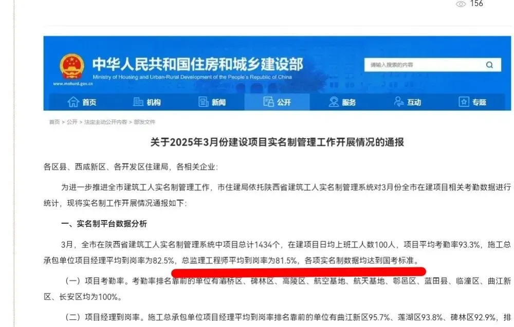 就像西安市2025年3月的情况通报,总监理工程师平均到岗率81.5%(如下图)每个月也都在进行检查和通报。