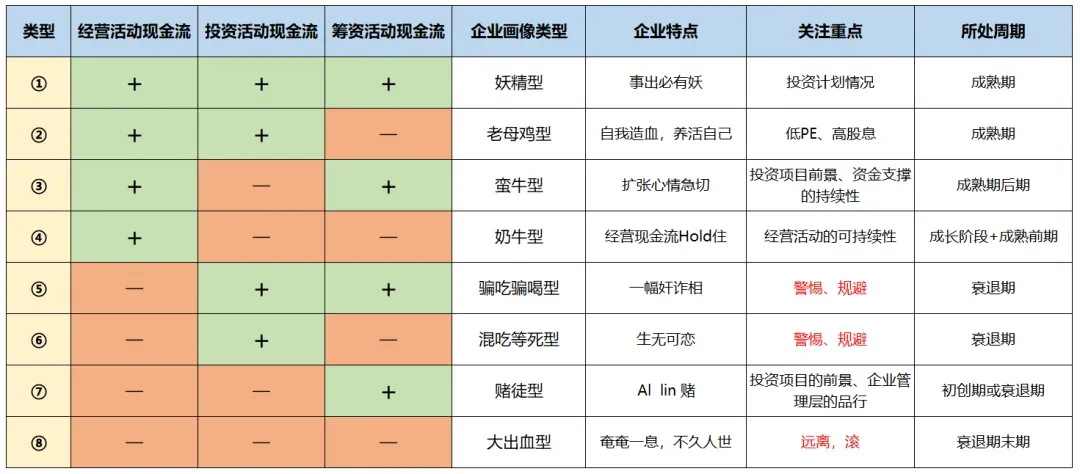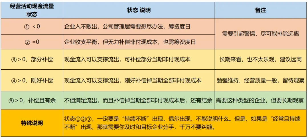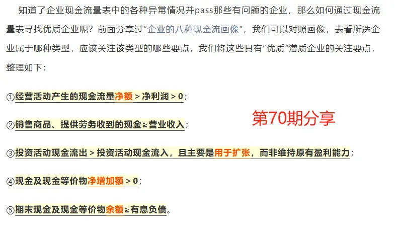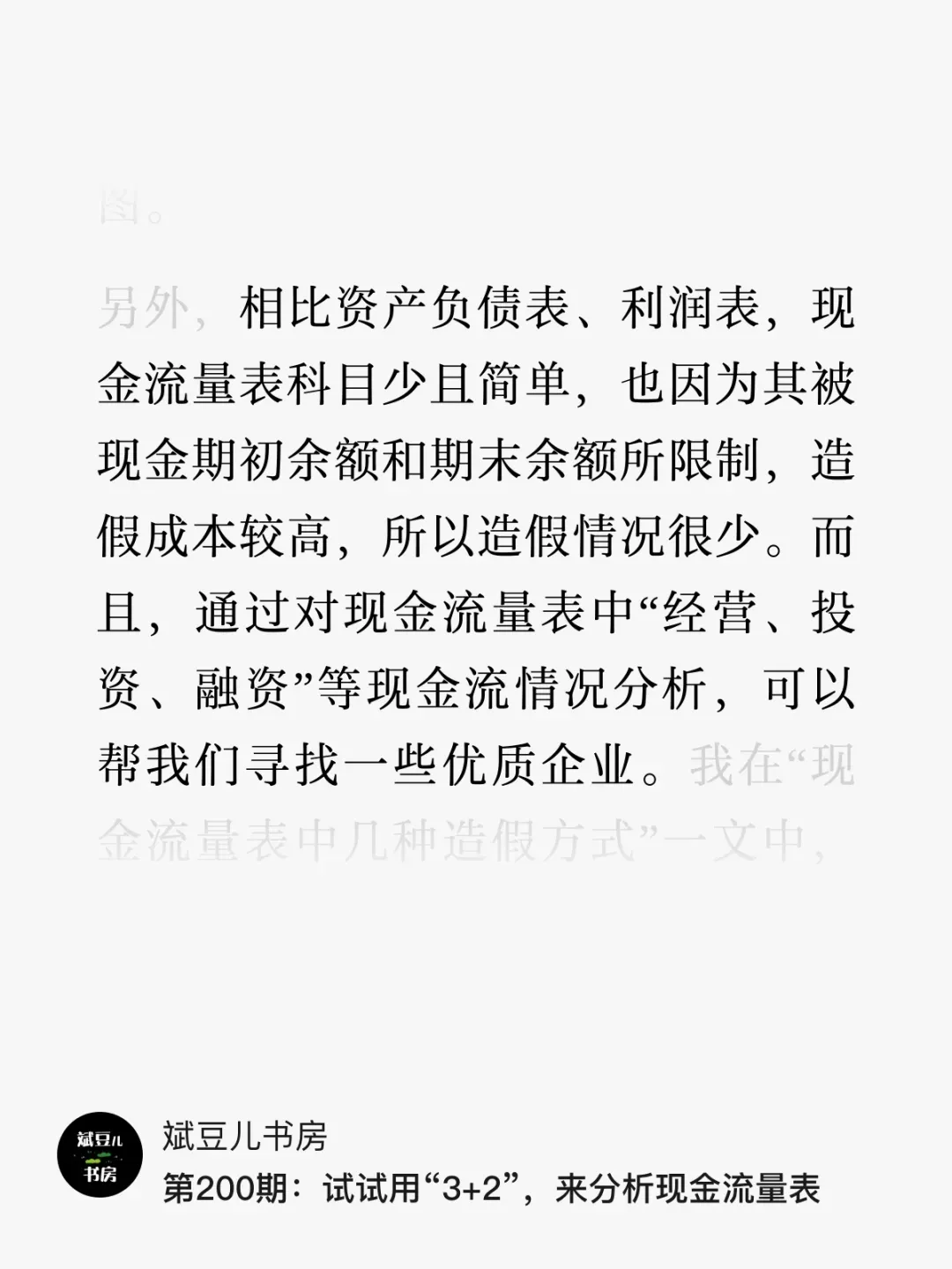 它反映的是一段时间内,公司实际收了多少现金,付出了多少现金,还余下多少。按照“经营、投资、筹资”等角度划分,分别是从哪里流入,为什么流出,这段时间到底是流入的多,还是流出的多。我在“试试用“3+2”,来分析现金流流量表”一文中,说“通过对现金流量表中“经营、投资、融资”等现金流情况分析,可以帮我们寻找一些优质企业”。