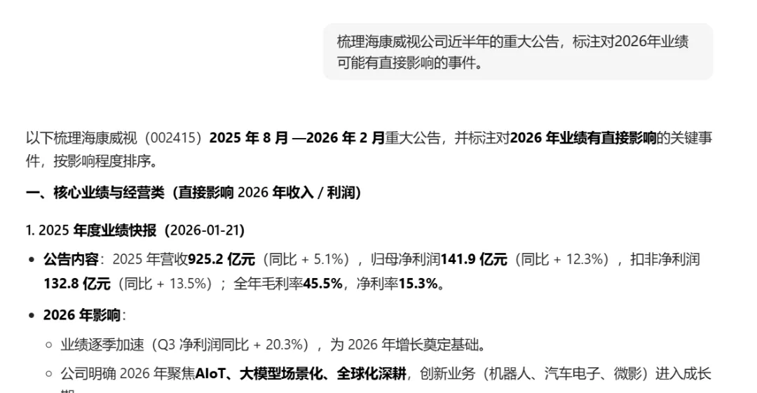 而这些信息,我们可以通过前期分析的获取财报的渠道来获取,也可以用AI来快速总结。比如,"梳理海康威视公司近半年的重大公告,标注对2026年业绩可能有直接影响的事件。"