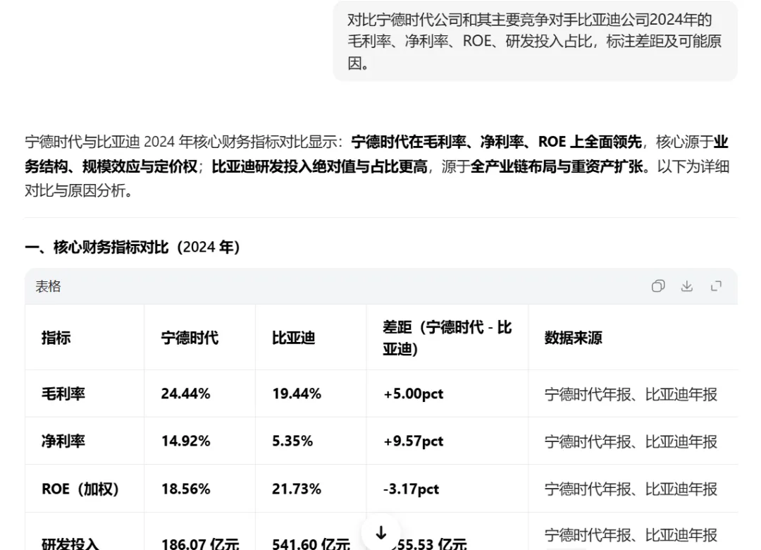 同样,我们可以用AI批量对比。比如,把“对比宁德时代公司和其主要竞争对手比亚迪公司2024年的毛利率、净利率、ROE、研发投入占比,标注差距及可能原因。"扔给AI,等着它给出分析结果,然后再交叉验证,选择可靠可信的数据结论。