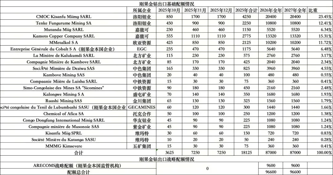 刚果(金)钴出口配额(2025-2027年)