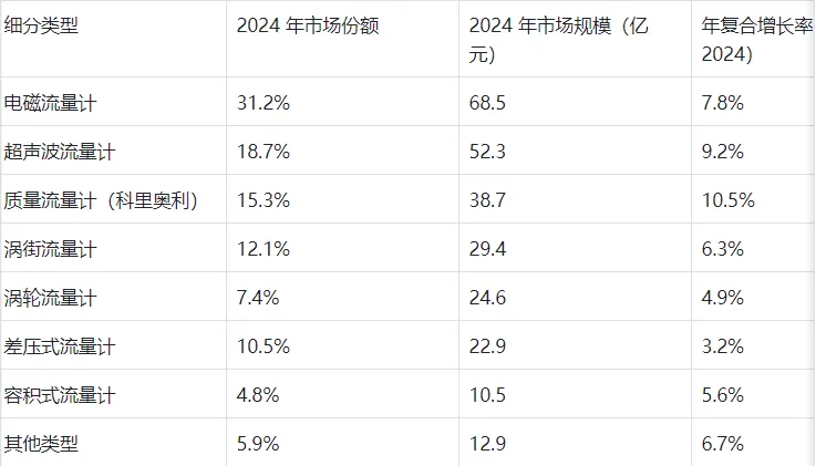 根据中国仪器仪表行业协会发布的《2024 年中国流量仪表市场白皮书》数据,2024 年全国流量仪表市场规模约为 218 亿元人民币,各主要细分类型的市场份额分布如下: