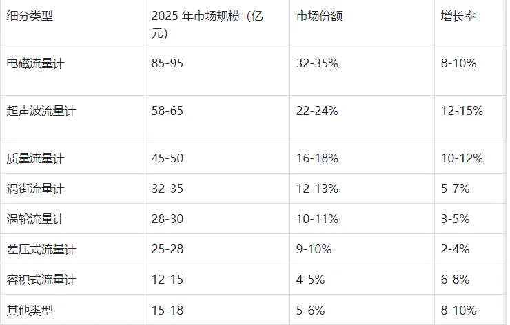 基于中国仪器仪表行业协会、智研咨询等权威机构的统计数据,2025 年各主要细分类型流量计的市场规模如下: