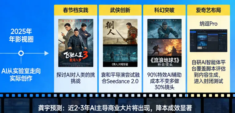 龚宇预测,AI主导生成的商业大片将在近2-3年出现。目前业内已有真人院线电影、真人剧集与综艺节目开始采用AI,降本成效显著。