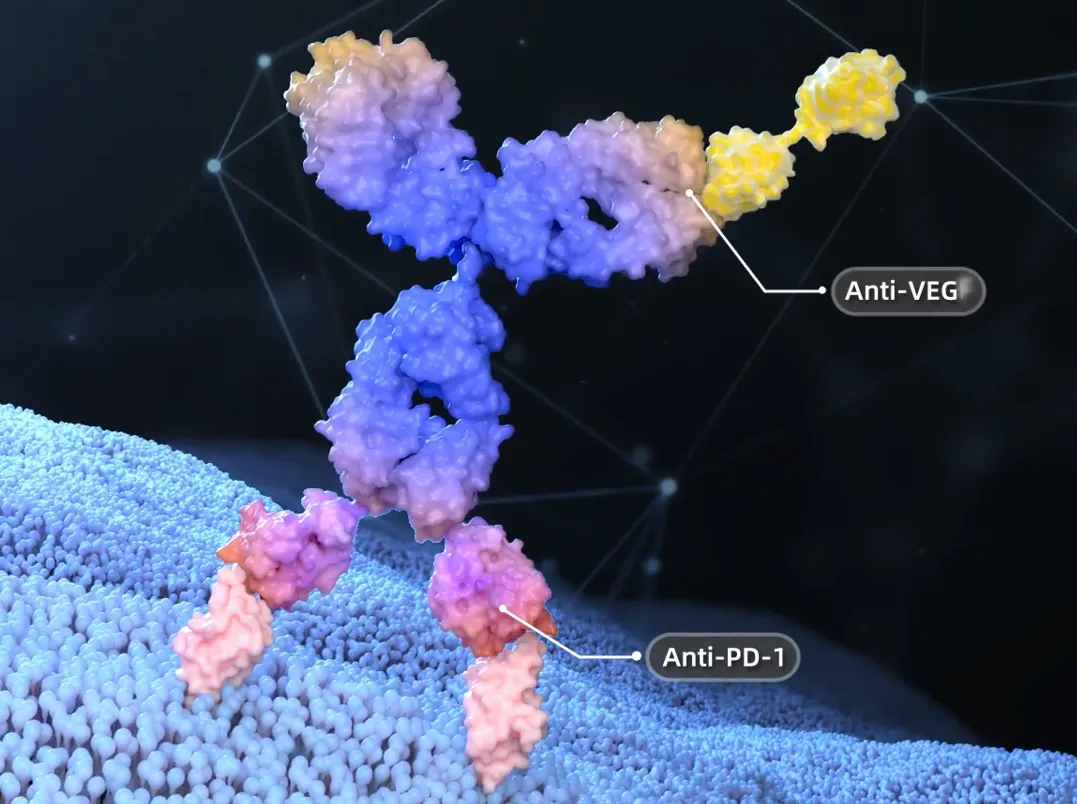 依沃西单抗由VEGF单抗的全部和PD-1单抗的抗原结合片段融合在一起,形成可兼具抗PD-1和抗VEGF功能的双特异性单克隆抗体。