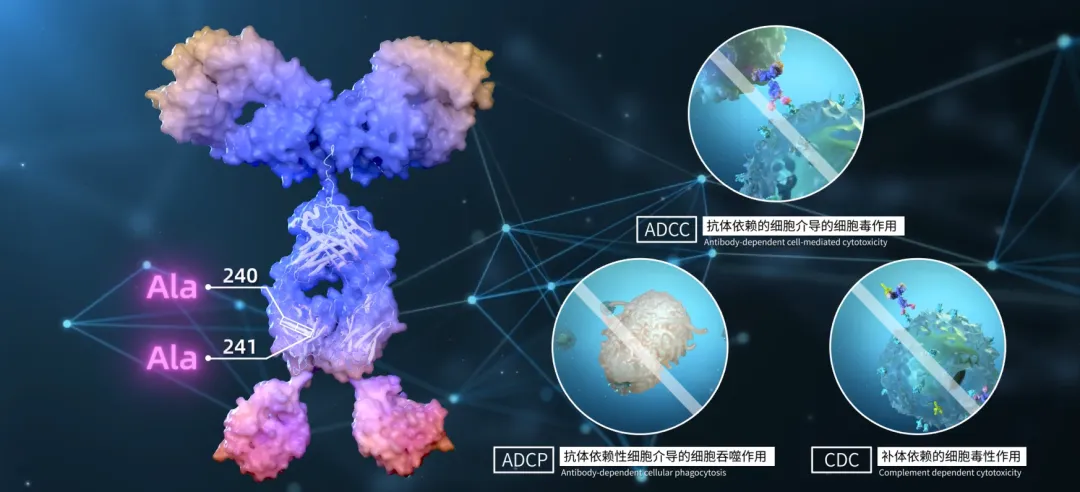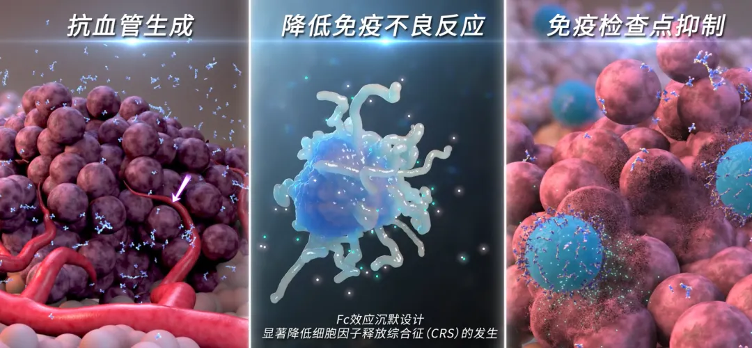 通过在Fc段引入两个氨基酸点突变后极大程度地降低了潜在的ADCC(抗体依赖的细胞介导的细胞毒作用)、ADCP(抗体依赖性细胞介导的细胞吞噬作用)和CDC(补体依赖的细胞毒性作用)效应,这种结构不仅使依沃西单抗兼具抗血管生成与免疫治疗的协同抗肿瘤活性,而且有效降低了潜在的免疫不良反应。