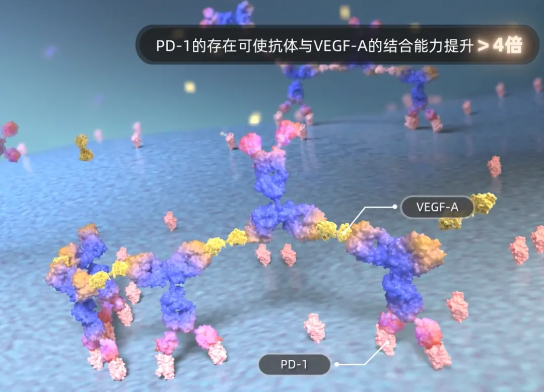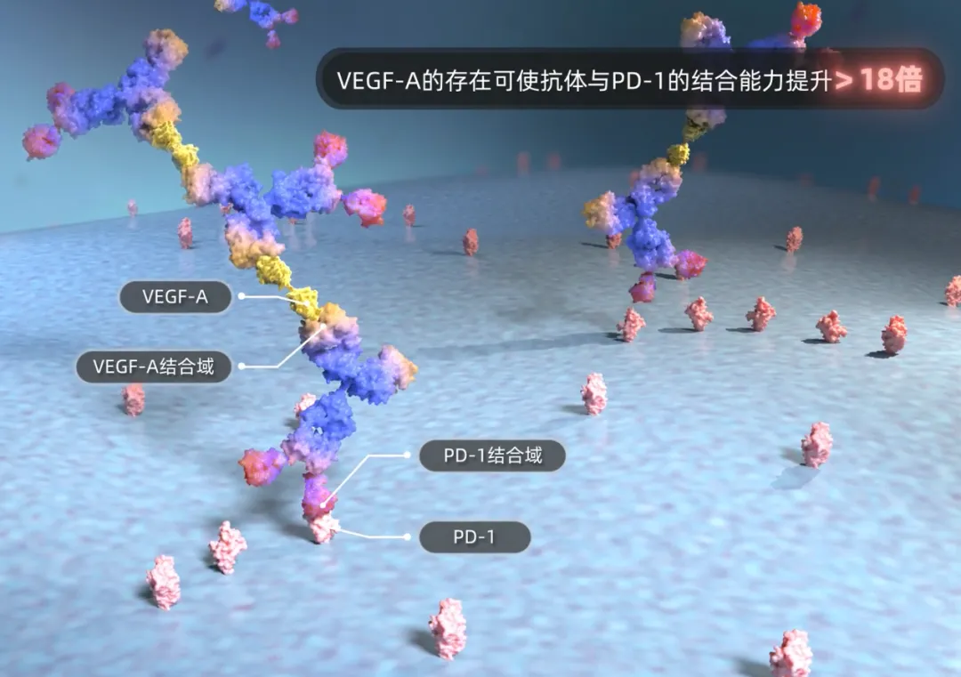 当有VEGF-A存在时,可将依沃西单抗与PD-1的结合能力提升18倍以上,当有PD-1存在时,可将依沃西单抗与VEGF-A的结合能力提升4倍以上。