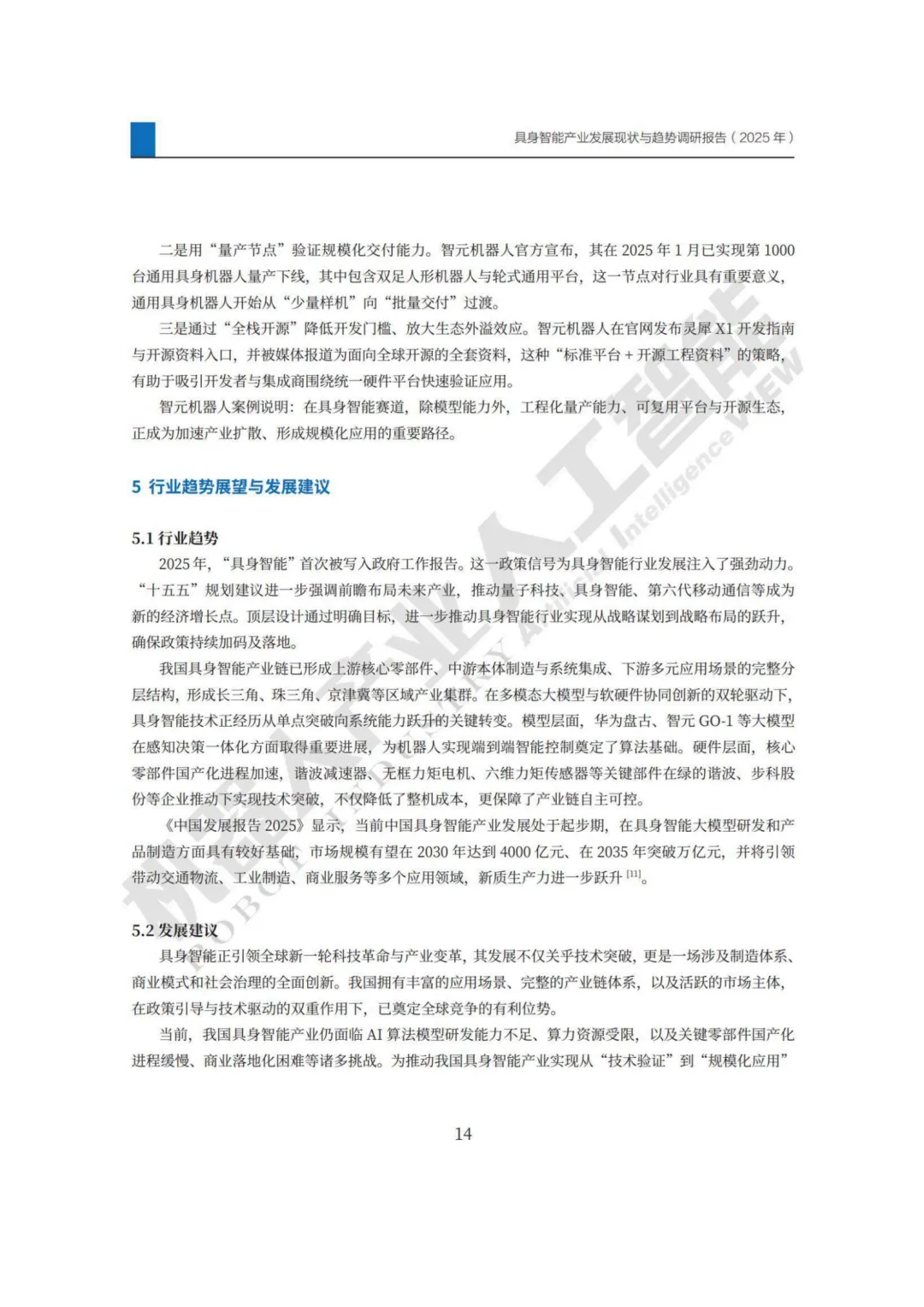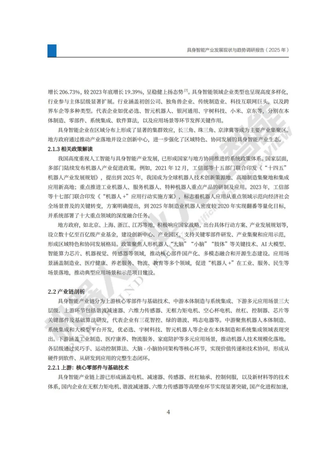 当人形机器人在工厂里精准地完成汽车装配,当四足机器人在危险的火场中执行搜救任务,当康养机器人温柔地协助老人进行康复训练……这些曾经只存在于科幻电影中的场景,正随着“具身智能”的崛起而加速照进现实。2025年,“具身智能”首次被写入政府工作报告,并被纳入“十五五”未来产业重点布局。一、 什么是具身智能?不止是“大脑”,更是“身体”具身智能的核心在于,智能体(机器人)通过物理身体,在真实环境中实现“感知-决策-行动-反馈”的闭环。它不同于传统工业机器人(只能执行固定程序),也不同于纯粹存在于云端的AI大模型(只能思考无法行动)。具身智能让AI拥有了“身体”,能够真正地理解世界并改造世界。 从理论溯源看,艾伦·图灵早在20世纪50年代就埋下了思想的种子,而如今,随着多模态大模型与机器人技术的融合,这一概念正迎来爆发。二、 产业态势:470亿美金市场背后的“中国速度”当前,中国具身智能产业正处在由L2(部分自主)向L3(条件自主)迈进的关键爬坡期。市场井喷:据摩根士丹利预测,2024年中国机器人市场规模已达470亿美元,预计到2028年将飙升至1080亿美元,年复合增长率高达23%。人形机器人的全球市场年复合增长率更是被预测将高达71%。企业激增:截至2024年底,全国智能机器人产业企业数量突破45万家,较2020年增长了超2倍。长三角、珠三角、京津冀成为三大产业集聚高地,上海浦东、深圳、苏州吴中区等地已形成千亿级产业集群。政策红利:从国家层面的《“机器人+”应用行动实施方案》,到北京、上海等地动辄百亿级的产业基金,政策“组合拳”正系统性地为产业保驾护航。报告将产业链清晰地分为上、中、下游三层,构成了完整的生态闭环:这是技术壁垒最高的环节,也是国产化的主战场。绿的谐波在谐波减速器上突破P型齿结构,步科股份的无框力矩电机正送往海外测试,柯力传感的六维力矩传感器性能持续提升。虽然行星滚柱丝杠、高端传感器等仍面临“卡脖子”挑战,但国产化进程已全面加速,从“可用”向“好用”跨越。这里聚集了优必选、宇树科技、智元机器人等明星企业。技术路径百花齐放:分层控制:让“大脑”(任务规划)与“小脑”(运动控制)各司其职。端到端大模型:英伟达、小米等企业正探索让视觉输入直接映射为控制指令。云边端协同:腾讯云与越疆科技的合作,平衡了算力与实时响应的矛盾。工业制造仍是当前最成熟的落地场景(焊接、质检、上下料)。但医疗康复(天智航、傅利叶)、商业服务(接待、配送)、乃至家庭服务(康养、清洁)正成为新的增长极。特别是康养领域,如身机器人等企业已跑通“高频刚需”的产业化路径。2025年被中信证券认为是人形机器人的量产元年,商业模式日益清晰:1. 软硬件一体化:优必选、智元机器人通过自研核心部件和算法,构建全栈壁垒。2. 平台化生态:华为云、智元机器人开放SDK、开源大模型,吸引开发者共建生态。3. 定制化解决方案:针对矿山、化工等极端场景,提供“远程操控+本地自主”的专用方案。4. 数据驱动闭环:通过真实场景部署机器人,采集高质量数据反哺模型,形成飞轮效应。如智元机器人已实现百万级数据采集。5. RaaS订阅制:“解决方案服务费+硬件销售分成”的模式开始出现,让客户门槛更低,企业收入更持续。技术瓶颈:硬件不成熟、高质量真实数据短缺,构建“数据飞轮”仍是最大难点。标准缺失:数据接口、测试标准不统一,导致协同成本高昂。供应链安全:部分关键零部件国产化率虽在提升,但高端制造工艺和材料稳定性仍是隐忧。C端落地难:企业普遍依赖政府采购,而面对家庭消费者,价格高(如宇树R1定价近4万元)、功能单一、安全隐患让市场培育周期被拉长。报告预测,到2030年,中国具身智能市场规模有望达到4000亿元,2035年突破万亿元。面对未来,报告提出了七大发展建议:强化基础研究攻关核心技术、完善产学研协同机制、健全法律法规与伦理标准、培养复合型人才、创新金融支持工具、拓展应用场景示范、构建开放产业生态。具身智能不仅是技术的较量,更是制造体系、商业模式与社会治理的全面创新。凭借完整的产业链、超大规模的市场和活跃的创新主体,中国正站在这一轮全球科技革命的潮头。正如报告所言,各方需保持战略定力,坚持长期主义,共同推动中国成为全球具身智能创新与应用的高地。
