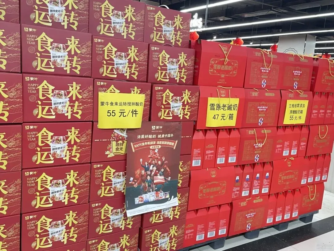 当地大润发设置了一条“乳品街”,满是在春节期间打折促销的乳制品。其中,蒙牛和伊利占据了半壁江山。