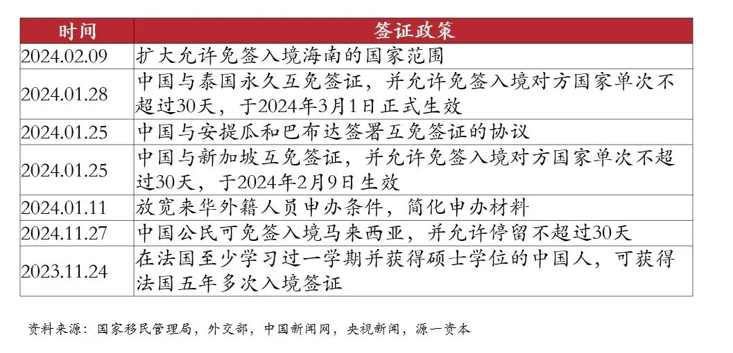 除了境内游之外,跨境游亦持续恢复。根据国家移民管理局数据,2024年春节假期全国边检机关共保障1351.7万人次中外人员出入境,日均169万人次,较2023年春节同期增长2.8倍,恢复至2019年春节同期的近九成(2022年春节仅恢复至2019年同期三成不到)[7]。根据携程的春节报告,携程出入境游订单均超出2019年同期。不仅仅是新马泰、港澳、日韩等短途目的地订单量相较2019年实现增长,中长途出境游(如沙特等一带一路国家、马尔代夫、英国、挪威等)订单增幅相较2019年亦非常明显。境外旅游消费升级趋势惹人注目,携程境外千元以上订单量达到2019年2.7倍[6]。另外,随着近期我国签证政策的放宽(见下),预计跨境游热情将持续高涨,跨境旅游将进入加速复苏新通道。