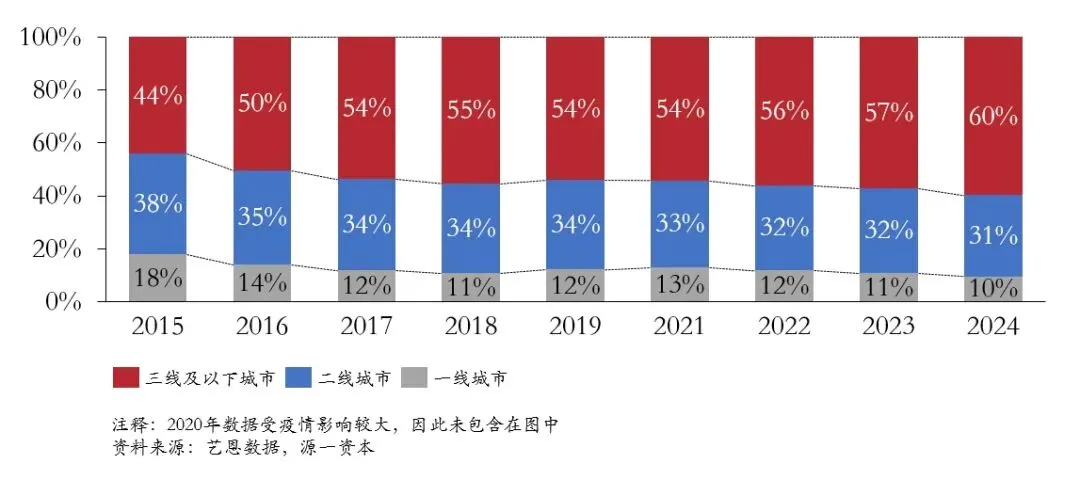 其中,下沉市场票房占比提升明显。自2015年来,低线城市票房占比正不断走高。三线及以下城市的票房占比由2019年的54%升至60%[9],成为绝对的消费主力军,这背后是低线城市的消费基础设施不断完善,以及民众对于文娱消费的热情不断提高、消费力逐渐提升。