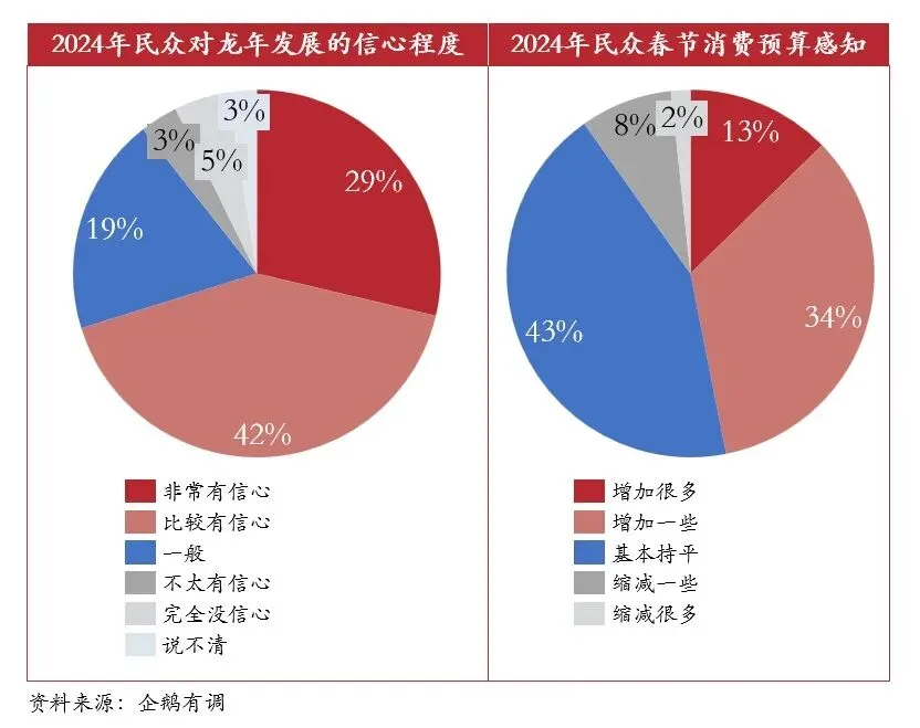 不俗的春节消费表现一方面是得益于今年更长的春节假期,另一方面是由于房地产市场不景气,消费力从房产消费转到节假日消费。强劲的春节消费为龙年的中国经济开了一个好头。根据企鹅有调数据,超70%的民众表达了对龙年发展非常或比较有信心的态度[3]。