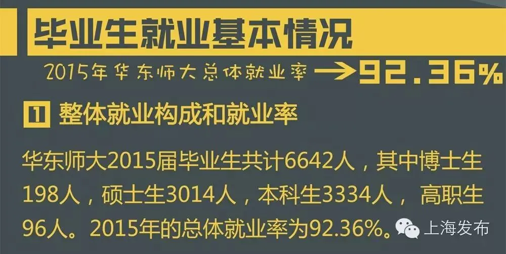 博士生就业率为84.34%,硕士生就业率为92.70%,本科生就业率为92.62%,高职生就业率为89.58%,2015年的总体就业率为92.36%。