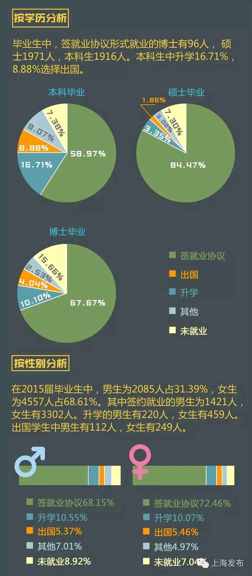 在2015届毕业生中,男生为2085人,占全部毕业生的31.39%,女生为4557人,占全部毕业生的68.61%。
