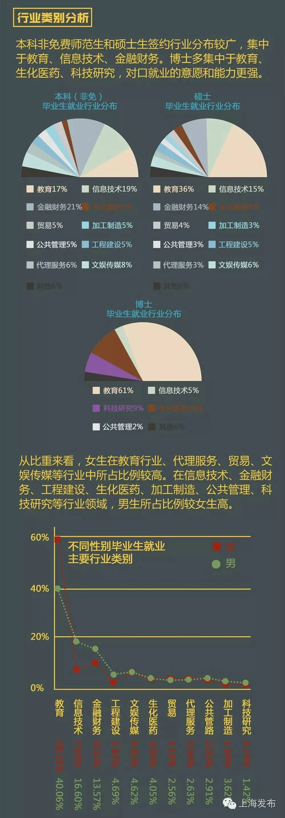 博士毕业生的签约行业多集中于教育、生化医药、科技研究,因其专业性强,对口就业的意愿和能力更强。