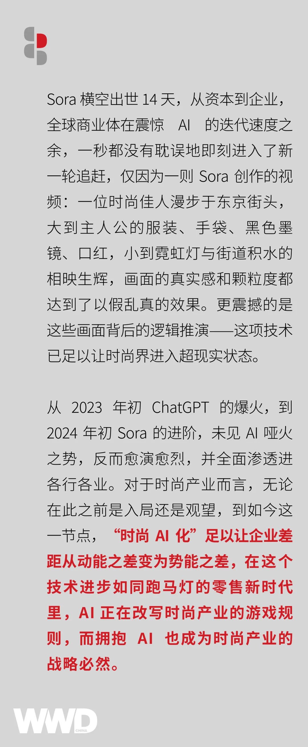 Sora 之举让 OpenAI 再次实现了“吸金”+“吸睛”,这种“双吸效应”是否能够溢出,谁又能第一时间抢摊登陆由 AI 进化出的“新世界”?技术发展滚滚向前,文生视频这一技术不仅拓展了时尚产业内容生产的全新方式及想象空间,更让企业深刻意识到:对技术的了解和应用不仅不停留于走马观花,而且是分秒必争、刻不容缓。