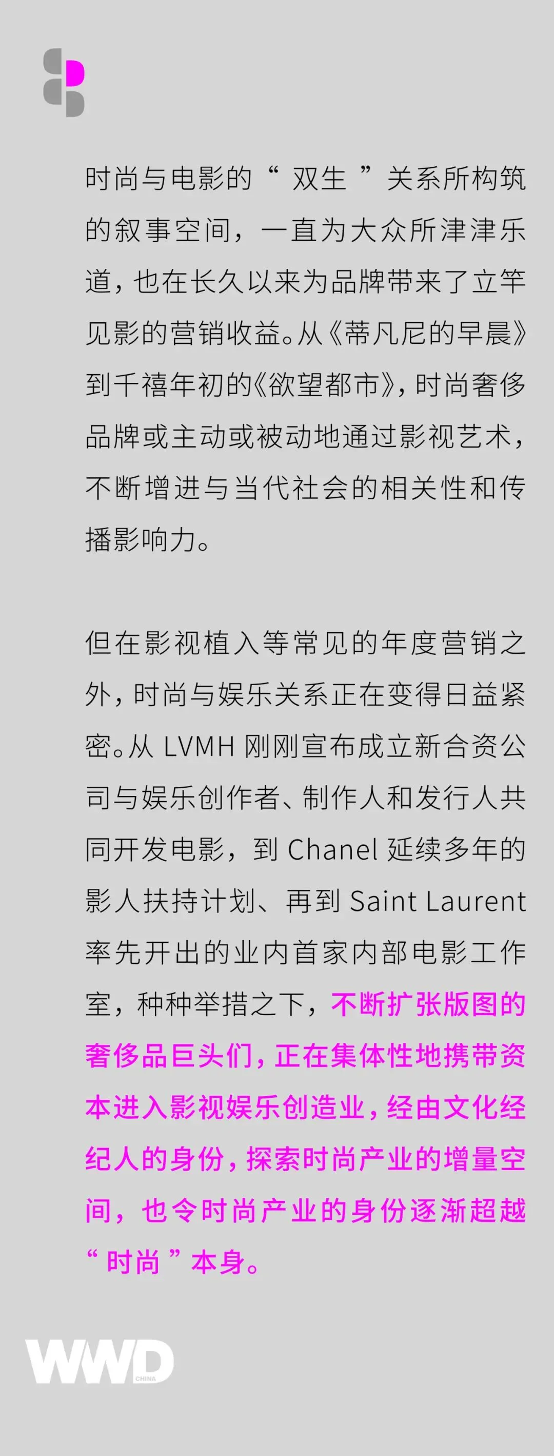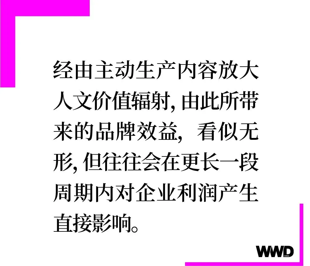 通过制作电影制片人的主要作品,时尚品牌正在摆脱之前一些导演主导的竞选电影所带来的广告声誉,将内容生产的主动权交由品牌方自身,而经由主动生产内容放大人文价值辐射,由此所带来的品牌效益,看似无形,但往往会在更长一段周期内对企业利润产生直接影响。正如 LVMH 集团北美区主席兼首席执行官 Anish Melwani 表示,LVMH 将每个品牌视为一个充满故事的时装屋和独特的文化创造者。集团不仅为讲述故事,更是为了进一步利用优质娱乐内容提升品牌体验。
