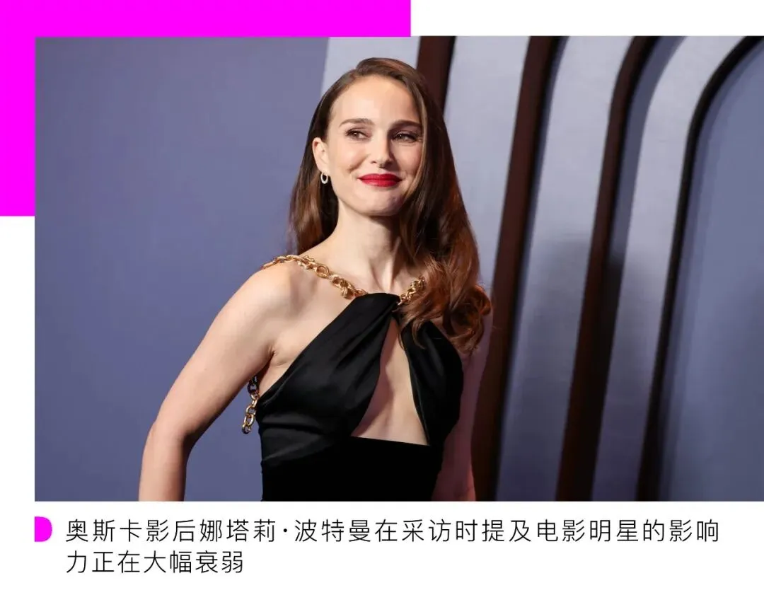 奥斯卡影后娜塔莉·波特曼在一次采访时提到,电影明星的影响力正在大幅衰弱。“电影作为曾经主要的娱乐形式开始衰落,现在看起来更加的小众了,如果你问像我小孩这样年龄的人电影明星是什么,对比网红 KOL,他们可能谁都不认识了。”