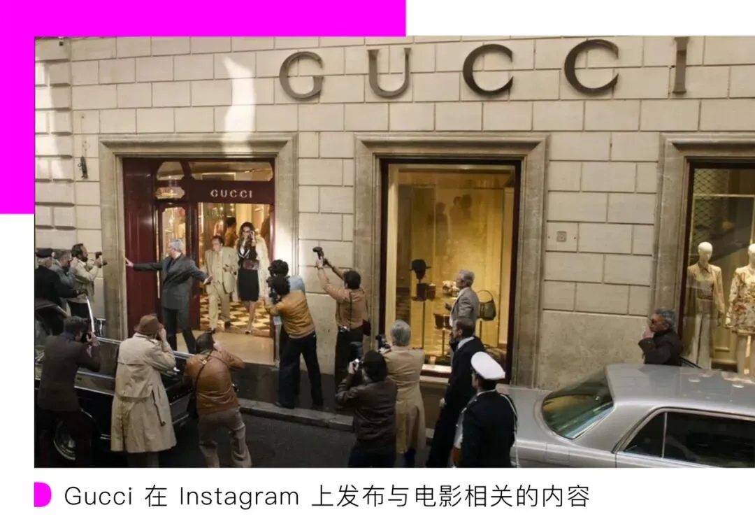 2021 年,通过讲述品牌历史,电影 House of Gucci 播出期间为品牌带来了可观的收入。电影播出期间,Gucci 服装的搜索量增长了73%,Gucci 包搜索量比前一周增长了 257%。伯恩斯坦的一位分析师表示,在 House of Gucci 的影响下,千禧一代将该品牌名称视为酷/亮/流行不同的俚语,这可能是当时最成功的有机营销活动之一。