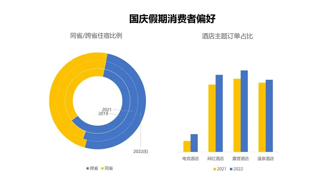 市场热度:阖家出行为主,80后、90后仍是消费主力 今年国庆期间, 80后、90后仍是消费主力,截至9月18日,80后、90后在酒店消费人群中占比分别达到41%和30%,00后成长迅速,占比同比2021年同期增长75%。另一方面,家庭游成为热点搜索关键词,人们选择酒店时更关注亲子房、家庭房等套房。 本异地、用户行为:出行半径及周期相对小长假拉长,十一为入住高峰国庆7天长假让消费者的出行选择更加丰富。尽管受疫情影响,本地游仍是主流,但中长线游成为今年国庆黄金周的重要趋势。一方面,上海、北京、杭州、南京、长沙等兼具客源地和目的地属性的城市,国庆假期酒店入住热度较高。另一方面,大理、西双版纳、迪庆等西南地区长线目的地的酒店入住热度相较中秋假期有所提高。根据预测,2022年国庆假期的酒店订单中,跨省酒店订单比例预计将达到50%以上,长线旅游需求得到一定的释放;省内住宿、本地住宿的时间相对延长,连住2天以上的订单占比近40%,相较中秋有所提升。“十一”黄金周期间的酒店入住高峰将出现在长假首日(10月1日),不少消费者也选择拼假等方式,在长假前一日错峰出游入住,避开客流高峰。“十一”黄金周期间,本地游、周边游需求仍然十分旺盛,动植物园、主题乐园等景区附近的酒店吸引了众多消费者的青睐,成为本地及周边市民放松身心、亲近自然的热门之选。而随着天气逐渐转凉,在温泉酒店度过也成为国庆假期休闲度假的趋势——国庆假期,温泉酒店的订单量同比2021年同期上涨5%。同时,年轻游客假期的休闲方式日趋个性化和多元化,或是趁着假期与好友相约电竞酒店“战个痛快”,或是打卡网红酒店“宅度假”,又或是趁着秋高气爽野外露营。截至9月18日,电竞、网红、露营主题酒店的国庆假期订单量占比同比2021年同期分别上涨50%、15%、10%。此外,选择于“十一”黄金周期间开展中长线旅游的游客,倾向于前往各地古城、古镇。近年来,各地依托古城/古镇文化和自然资源,打造包括集自然景观、农事体验、休闲旅游为一体的田园综合体,全面推进古城/古镇风貌提升,助力美丽乡村建设。对习惯面对钢筋水泥的城市游客来说,同时兼具当地民俗特色和完善商业设施的古城古镇,无疑既满足了消费者吃、住、购的生理需求,又满足了消费者欣赏自然风光、体验乡村民俗的精神需求。虽然酒店业整体表现还未达到预期,但仍有部分省市的酒店市场表现强劲,超过疫情前水平。以迪庆为例,截至9月18日,国庆期间入住迪庆的酒店预订量同比2019年增长逾30%。迪庆作为西南长线旅游目的地,酒店订单多为跨省订单,消费者主要来自上海、广东、浙江等地,以90后女性消费者为主。消费者在选择酒店时,倾向于住在独克宗古城附近,五星酒店的订单占比同比2019年有所下降,平均住宿时间在1晚左右,平均卖价接近1000元。而同样表现超预期的平潭地区,消费者分布和酒店偏好则与西双版纳地区有着明显差异。截至9月18日,平潭酒店的消费者主要来自上海、浙江及福建本省,海景房受欢迎,高星酒店的订单占比同比2019年同期提高近100%,平均住宿时间在2晚,平均卖价在600元左右。1.在房型设置时,考虑设置更多的家庭房、亲子房等,同时灵活安排加床政策,方便客人携全家入住; 2.紧密关注本地防疫及隔离政策,及时更新通知,提前设置自动回复,方便客人便捷、快速的获取相关疫情政策信息;3.考虑报名安心取消等活动,优化升级取消政策,让消费者无后顾之忧。