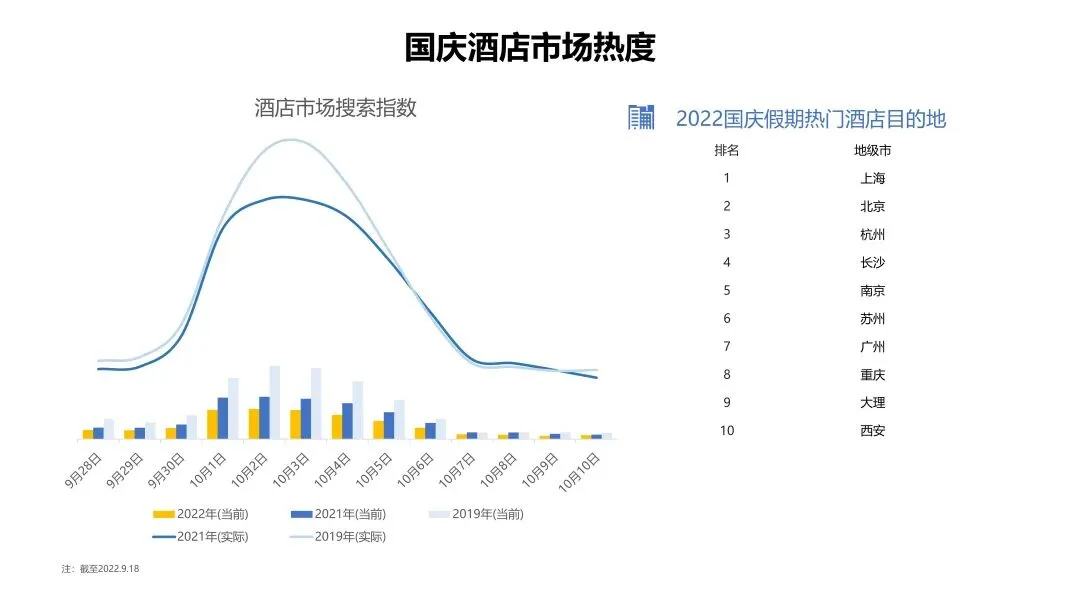 临近国庆,疫情防控态势严峻,国内整体酒店市场表现稍显冷清,预期热度恢复至2021年同期7成,上海、北京、杭州、长沙、南京位居酒店热门搜索目的地前列,西双版纳、平潭、迪庆等地酒店热度上涨较快,恢复疫情前水平。“十一”黄金周,酒店主力消费人群集中在80后、90后,电竞、露营、温泉酒店吸引了本地及周边用户的关注,而古镇古、古城商圈附近的酒店,则受到跨省用户的青睐。9月以来,全国29个省份报告了新增本土感染者,部分地区社区传播和疫情外溢仍未完全阻断,防控形势严峻复杂。当前,全国疫情在局部时有发生。前期疫情较重的重点省份取得疫情防控的阶段性成效,个别省份的部分地市疫情仍在发展中。为确保国庆前后不发生本土规模性疫情,最大限度减少对生产生活的影响,让人民群众度过一个健康、平安、祥和的假期,国务院联防联控机制,强化优化了一系列防控政策措施,包括倡导广大群众国庆假期在本地过节、跨省出行需持48小时内核酸检测阴性、推广“落地检”等。在此背景下,今年国庆假期酒旅市场稍显冷清。截至9月18日,机票市场搜索热度约为2021年同期的50%、2019年同期的30%,火车票市场搜索热度约恢复到2021年同期的50%。酒店市场搜索热度约恢复至2021年同期7成、2019年同期的5成。机票热门搜索目的地主要集中在上海、北京、广州、深圳、昆明等城市,火车票方面,热门搜索目的地包括杭州、广州、长沙、武汉、南京,而上海、北京、杭州、长沙、南京则位居酒店热门搜索目的地前列,其中,南京酒店搜索同比2021年同期增长15%,此外,西双版纳、平潭的酒店搜索涨幅(同比2021年)分别达102%、73%。