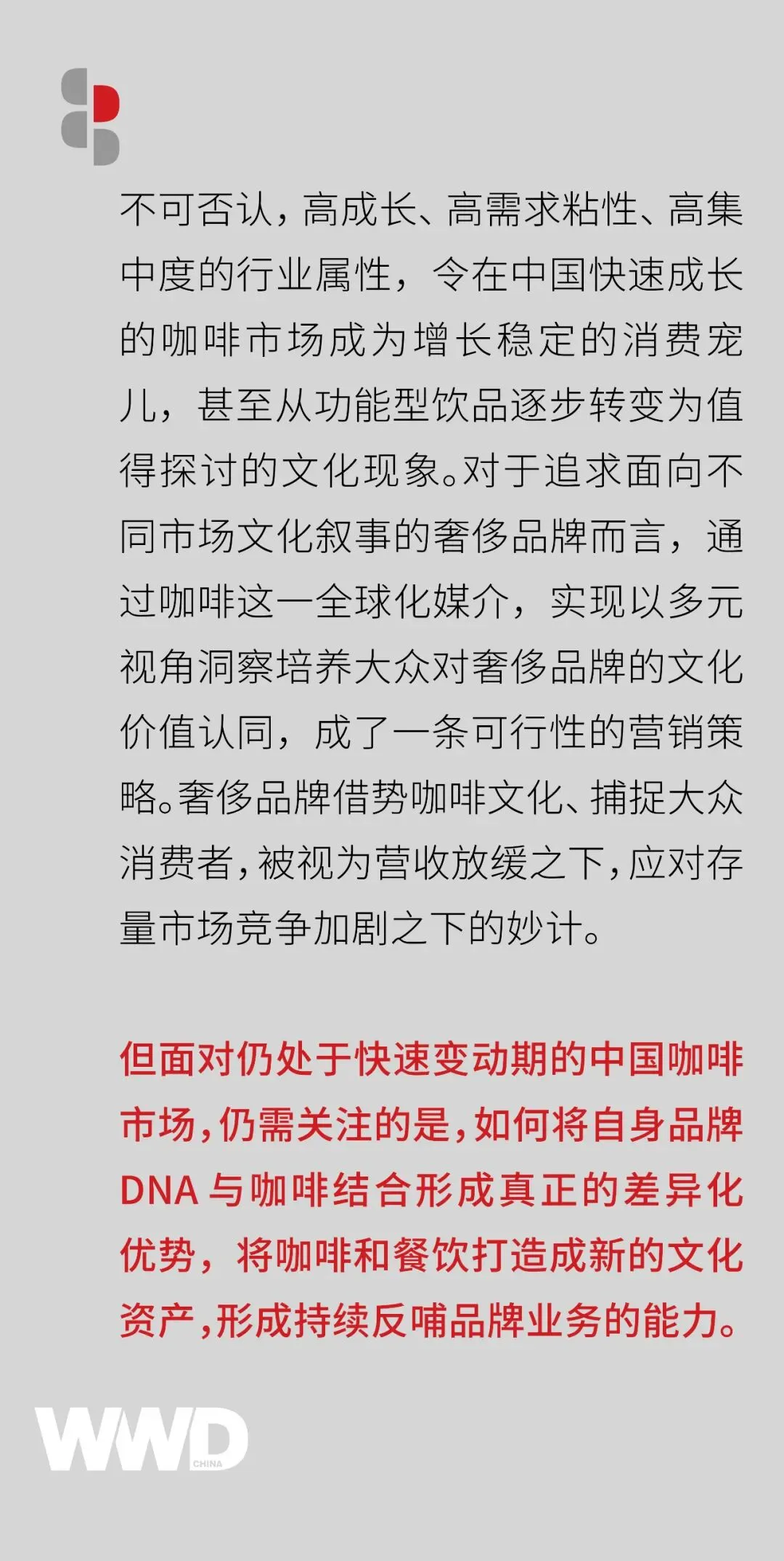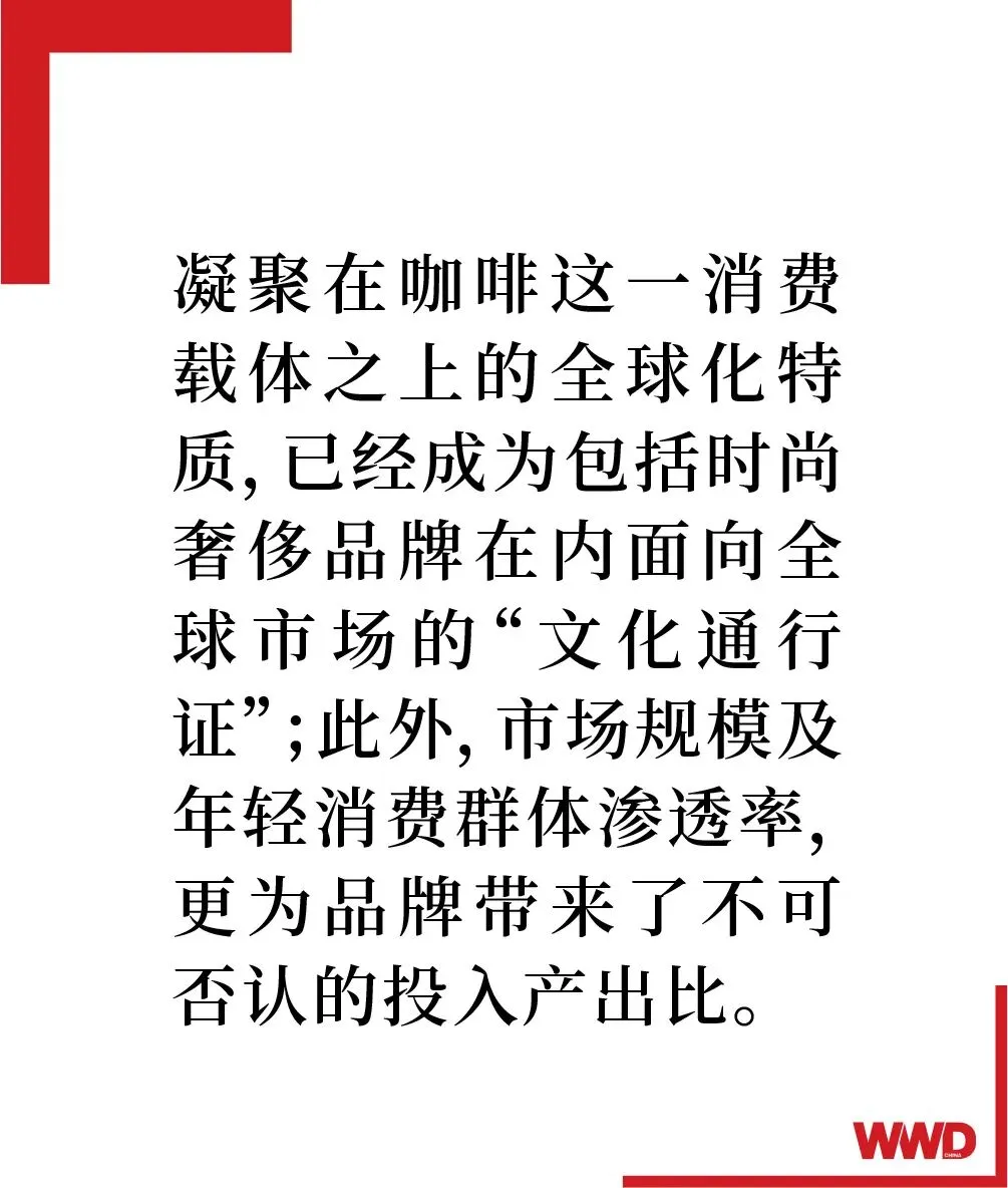 换句话说,如今凝聚在咖啡这一消费载体之上的全球化特质,已经成为包括时尚奢侈品牌在内面向全球市场的“文化通行证”;此外,正如前文所指出的市场规模及年轻消费群体渗透率,更为品牌带来了不可否认的投入产出比。