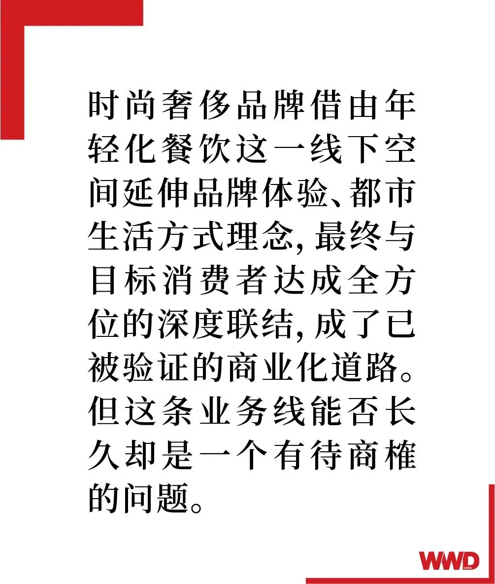 时尚奢侈品牌借由年轻化餐饮这一线下空间延伸品牌体验、都市生活方式理念,最终与目标消费者达成全方位的深度联结,成了已被验证的商业化道路。但这条业务线能否长久却是一个有待商榷的问题。