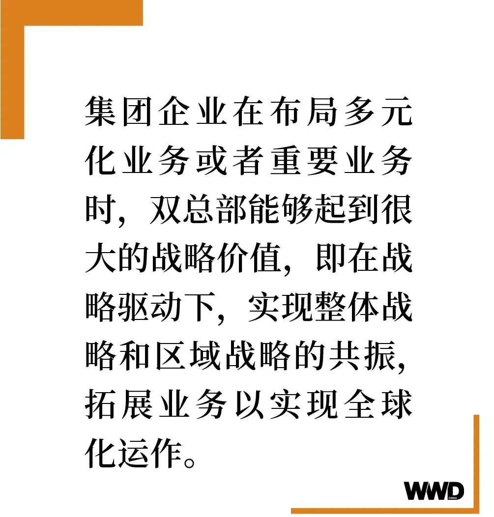 适用于大多数时尚企业的“伞形结构”,即在母国市场设立全球唯一总部,并在全球各地直接投资控股或参股当地企业,从而形成全球化的业务结构。然而,集团企业在布局多元化业务或者重要业务时,双总部能够起到很大的战略价值,即在战略驱动下,实现整体战略和区域战略的共振,拓展业务以实现全球化运作。