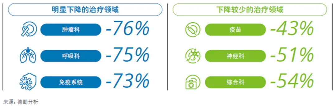 各治疗领域的变化和需求各不相同,肿瘤领域的自办会议量和临床药物消费下降幅度最大。
