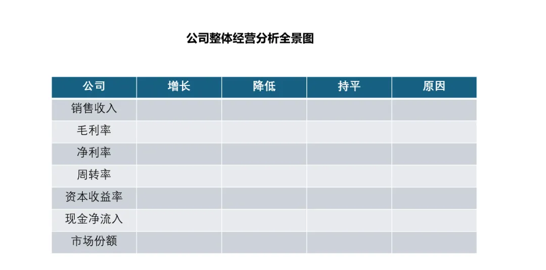 在分析的过程中,现金流净流入是正的还是负的,如果是正的,需要分析是那些因素导致现金流净流入为正,例如(1)是企业货品周转效率提升了多少,加快了企业现金的流入,或者(2)货品进行了重新的组合销售,带来了更高的收入。在完成了这部分分析之后,(3)继续分析可持续增长,通过时间维度,进行指标的同期对比,及接下来采取什么样的措施,为将来一段企业现金净流入增长提供支持。(4)最后基础整个行业的视角,看企业的市场份额,是增长了,还是下降了,分析其中的原因,为下一步措施行动提供结论。