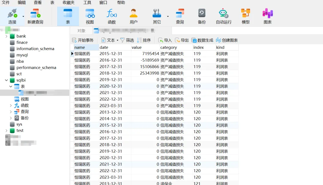 这里我通过Navicat工具展示企业数据库数据的情况,如下图,这里的字段与数据可以为接下来的企业分析提供数据支持。