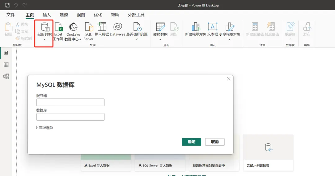 在获取数据选择Mysql数据库,输入服务器的IP与数据库名称,如下图,单击确定,