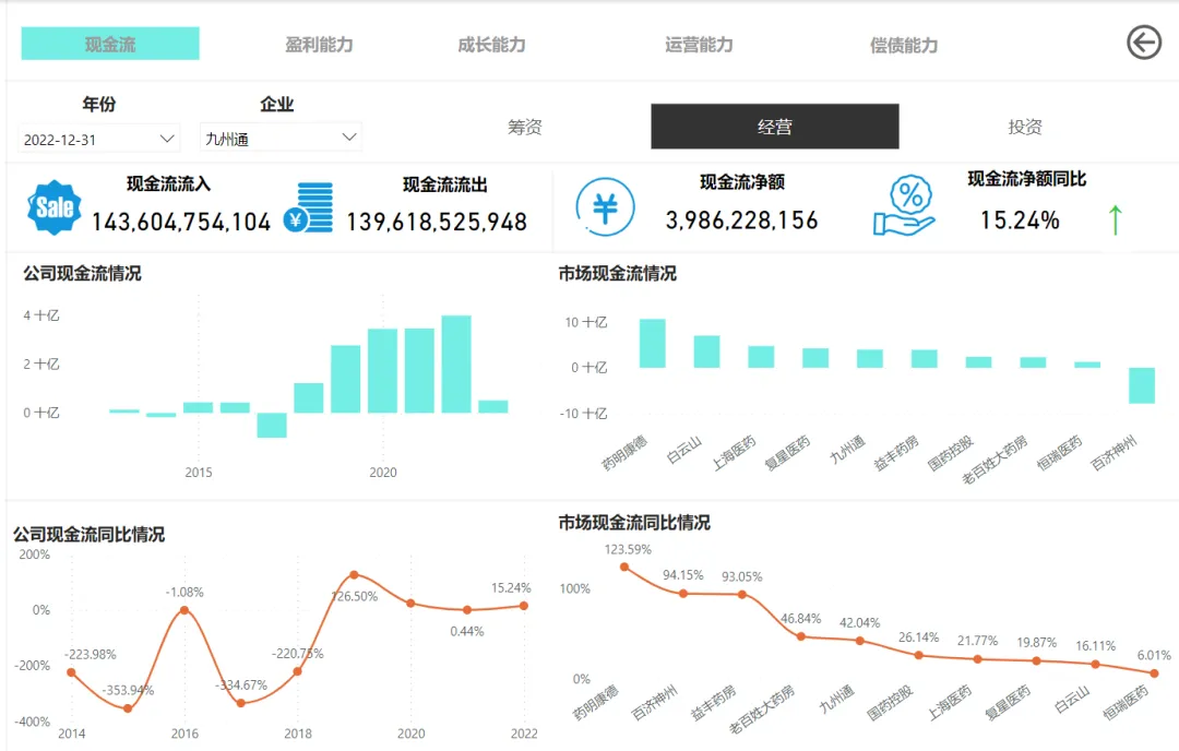 在分析框架的基础下,完成数据计算之后,就可以通过动态交互可视化进行分析,举例,就企业现金净流入情况进行分析,并结合市场同类企业进行分析,如下图