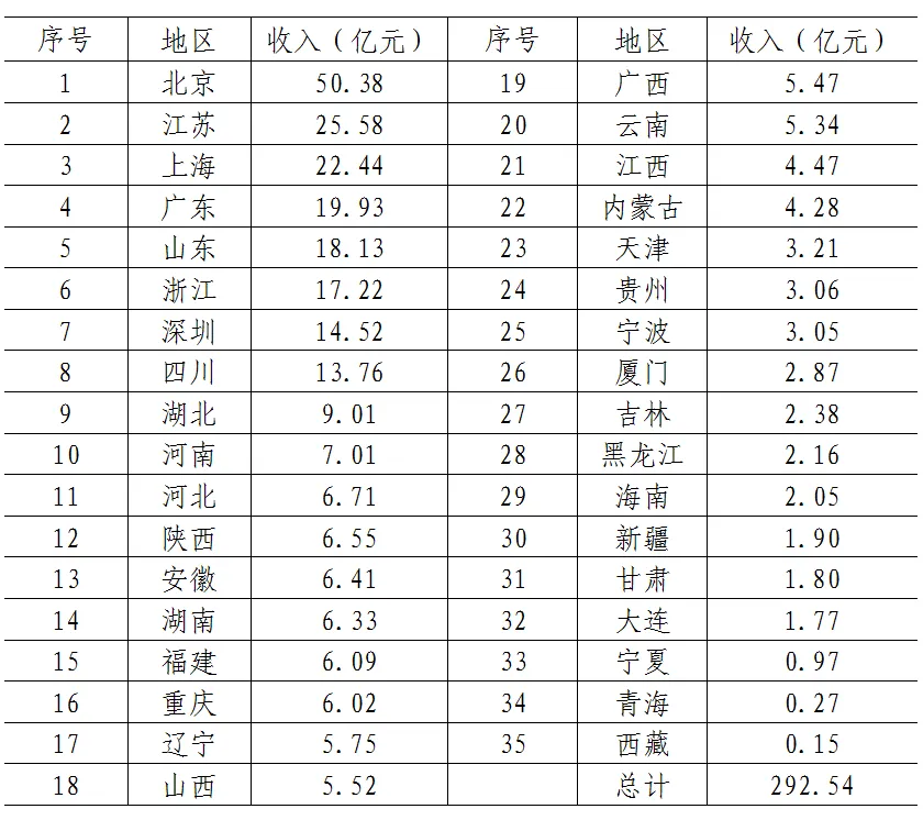 2022年,资产评估行业实现业务收入292.54亿元,较2021年增加0.1亿元,增长率为0.03%。2022年,全国35个地区资产评估机构实现的收入总额及收入分布情况如表1所示。