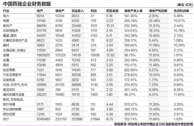 而百强企业中大于这一平均值的行业,分别是电器22.46%、房地产21.97%、互联网服务18.31%、建材17.08%、汽车及零配件13.93%、专业连锁销售12.48%、金融和综合贸易,并列为11.92%。