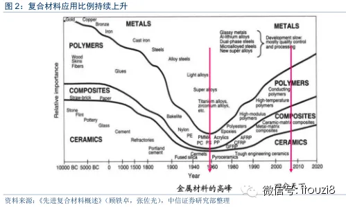复合材料在航空领域的发展大致经历了次承力构件—尾翼级主承力构件—机翼—机身主承力构件四个阶段,逐渐由小型构件向大型核心构件,由军用向民用发展。在欧美,20世纪60年代是复合材料的研发阶段,70年代进入应用阶段,此后复合材料在飞机上的应用比例逐步提升。