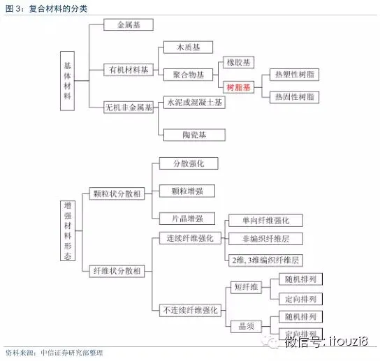 1)按基体材料类别,复合材料可分为金属基、有机非金属基与无机非金属基,如树脂基、铝基、钛基复合材料等;