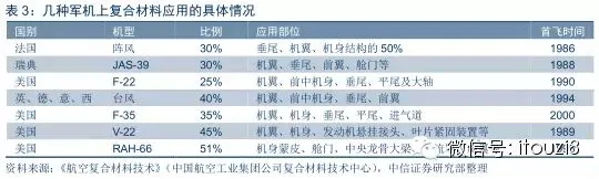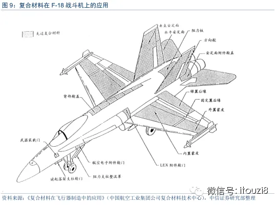 70年代中期,诞生了以碳纤维为增强体的高性能复合材料,开启了复合材料在飞机上的大规模应用。具有卓越高比强度、高比模量、耐腐蚀、耐疲劳性能的碳纤维增强复合材料非常适合航空装备需求。军机的垂尾、平尾等受力较大、尺寸较大的部件开始逐步使用碳纤维增强复合材料,如F-15、F-16、Mig-29、幻影2000、F/A-18等飞机的复合材料尾翼、垂尾。从70年代至今,国外军机尾翼已经全部采用复合材料。采用复合材料的平尾、垂尾一般占飞机全部结构重量的5%-7%。