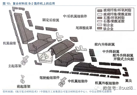 目前世界先进军机中复合材料用量占全机结构重量的20%-50%不等,主要应用复合材料的部位包括整流罩、平尾、垂尾、平尾翼盒、机翼、中前机身等。如果复合材料占飞机总重量的50%左右,则全机绝大部分结构件由复合材料制成,如B-2隐形轰炸机。